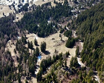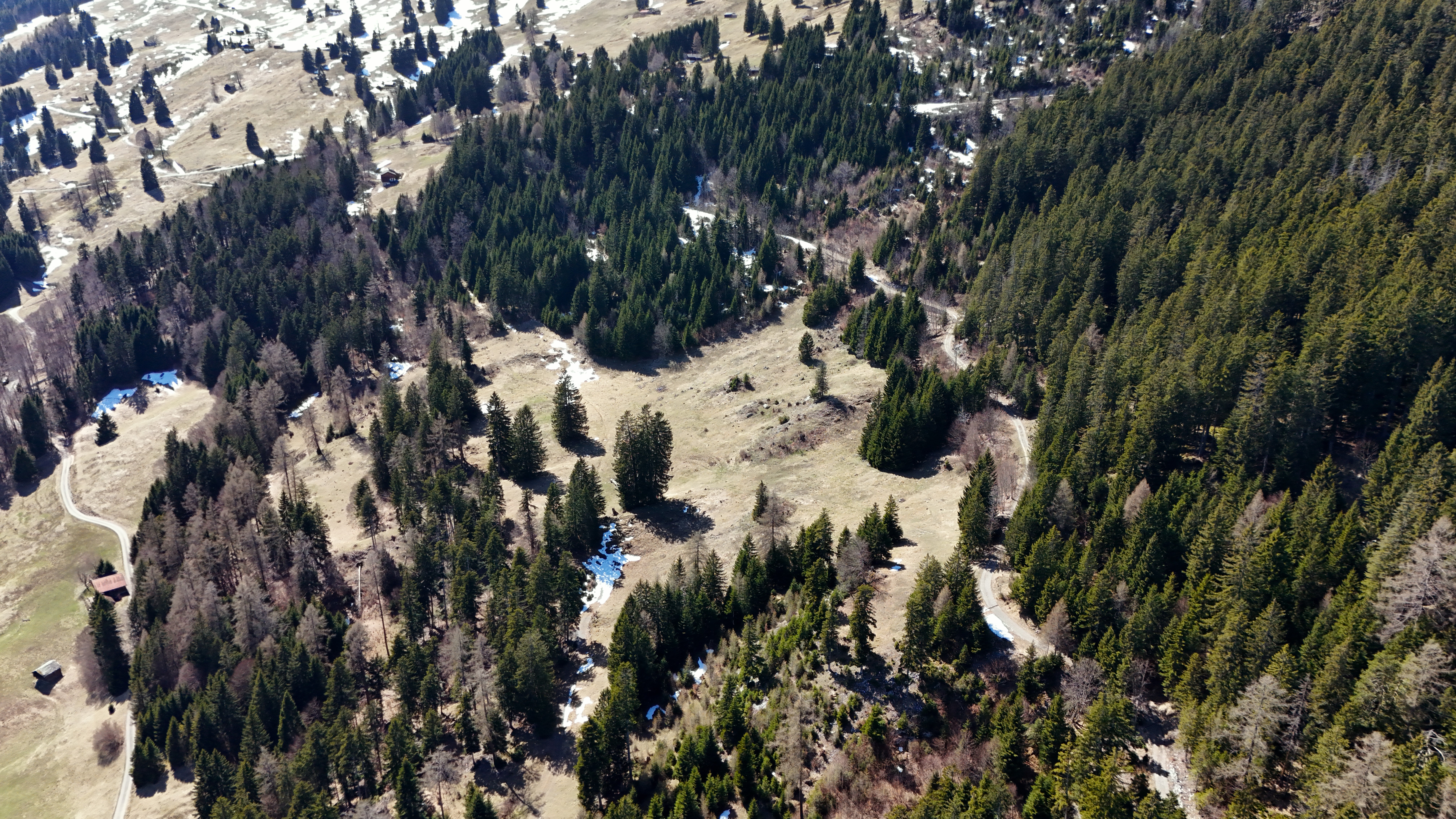 Blick von Nordosten hinab auf die Bergwiese im Bäragüllawald. Rechts schlängelt sich der Alte Alpweg am Waldrand entlang, links unten ein kurzes Stück der…