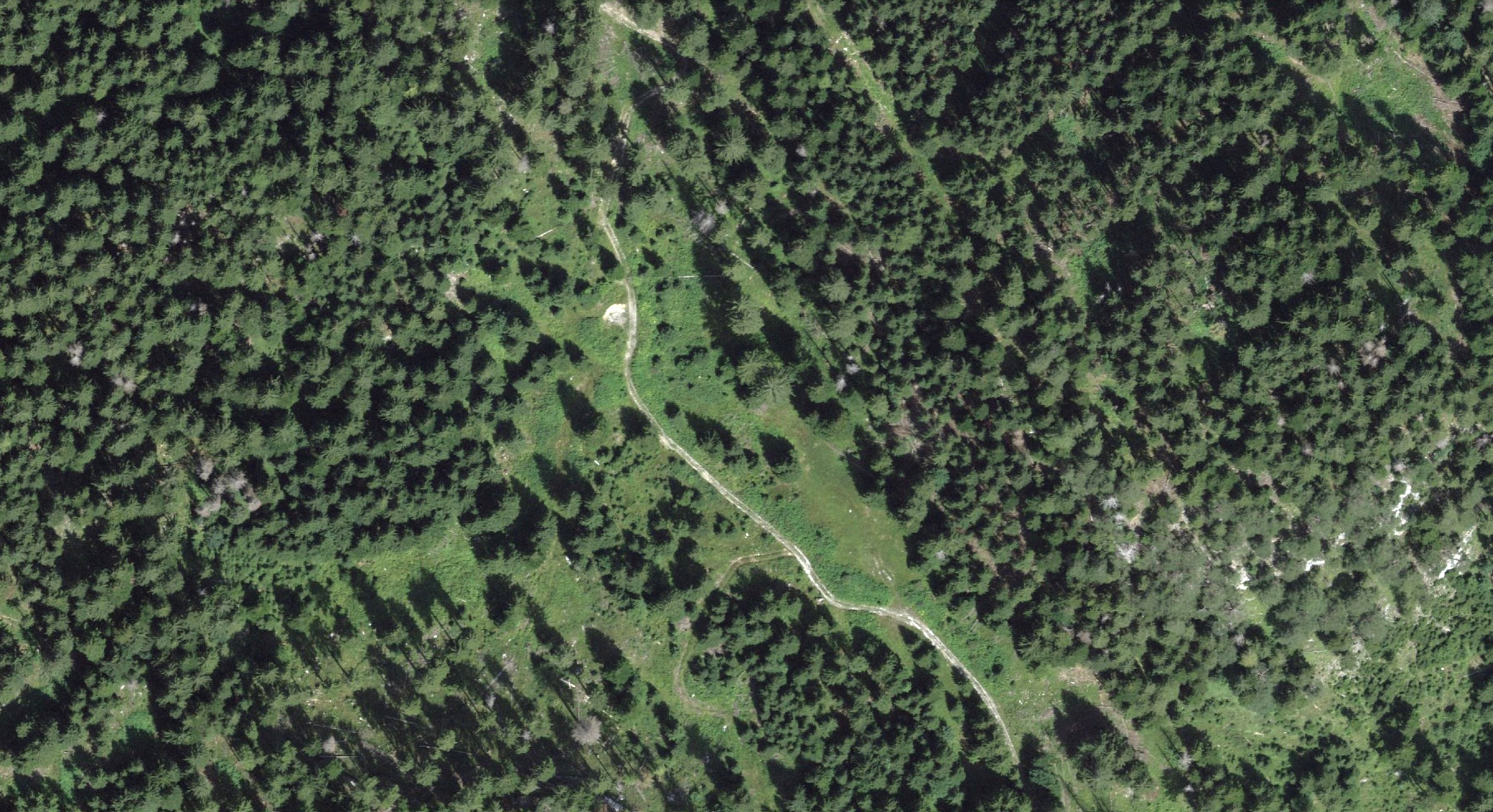 Ausschnitt aus einer Aufnahme von Ende Juli 1940 aus ca. 3'702 m Höhe, die damalige Waldlichtung Schöna Boda befindet sich in der Bildmitte. Über sie führte…