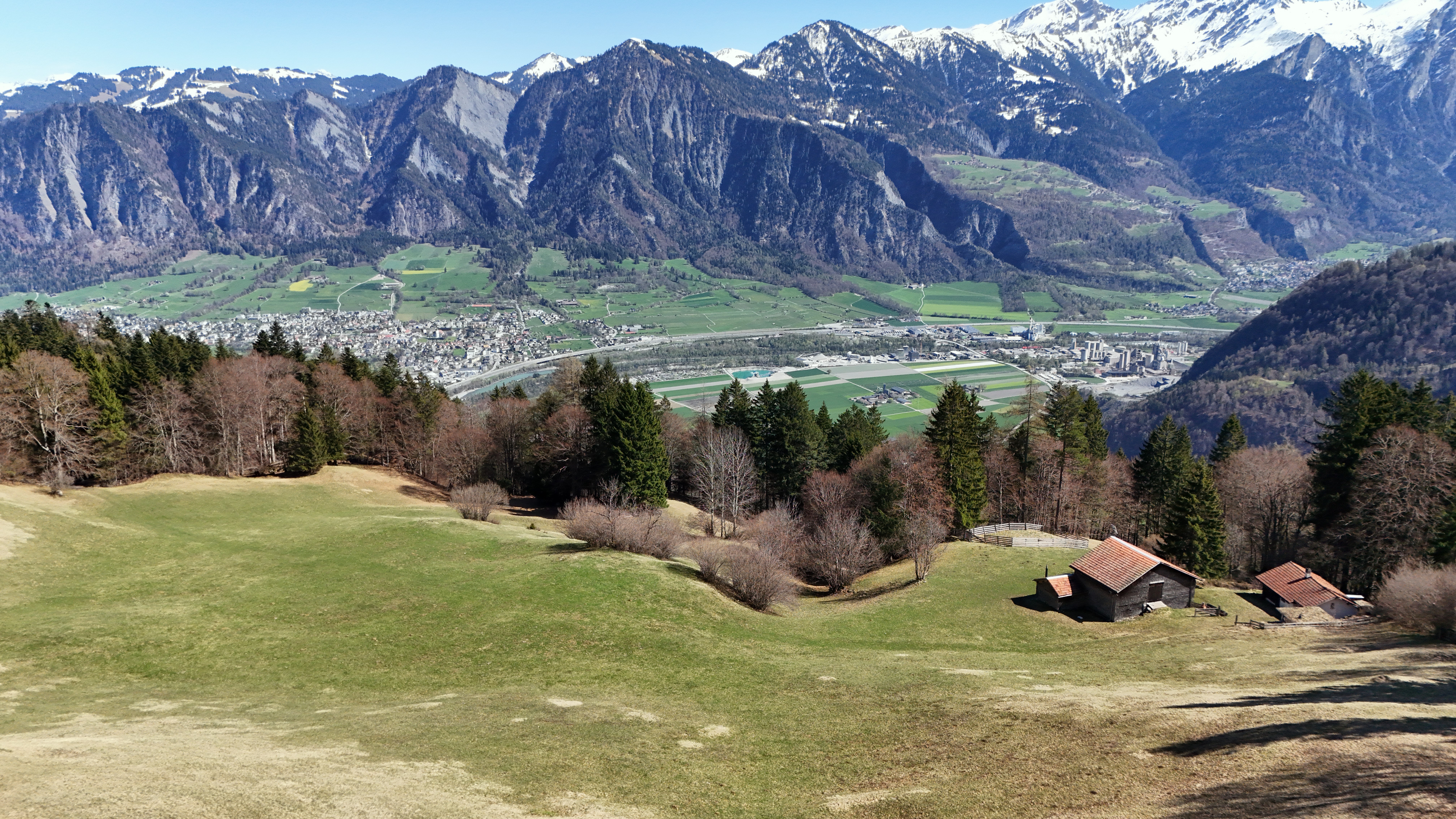 Blick nach Osten über die unteren Bereich der Bergwiese hinweg ins Rheintal. Gegenüber die Berge der Hochwang-Gruppe. Aufnahme von April 2026.
