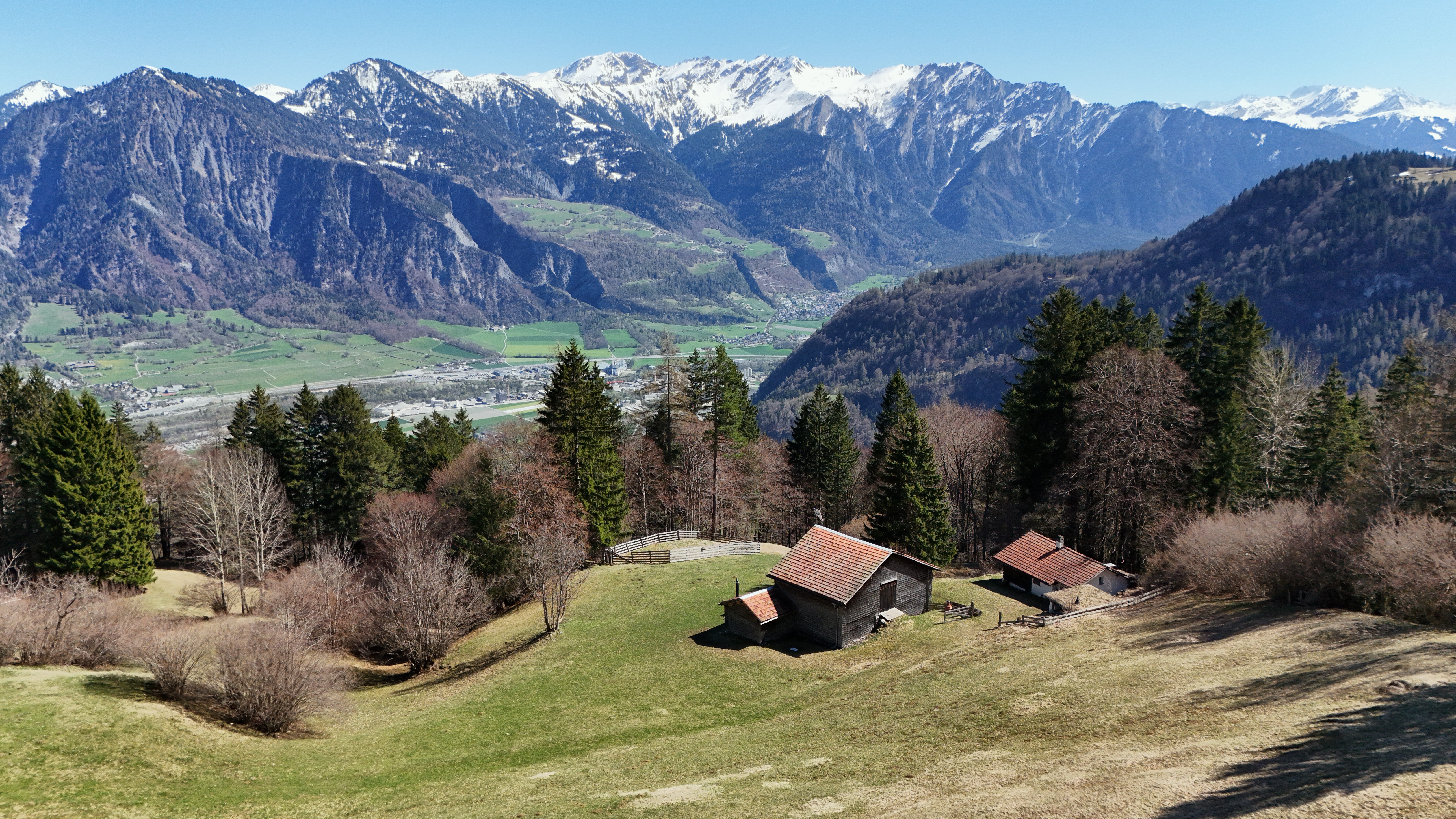 Blick von Nordwesten auf die Gebäudegruppe am unteren Südostrand der Bergwiese. Dahinter das Rheintal und die Hochwang-Berge.