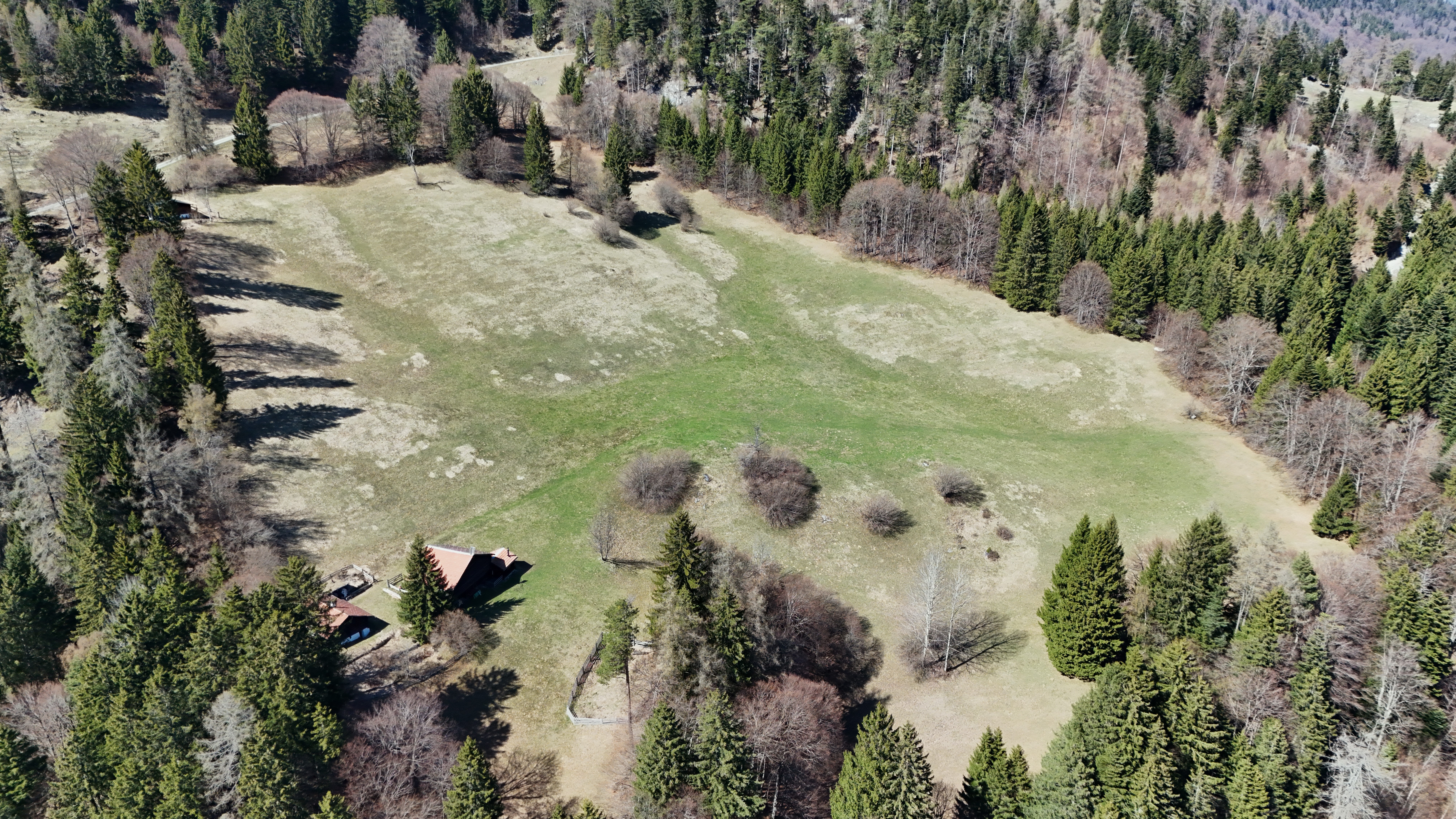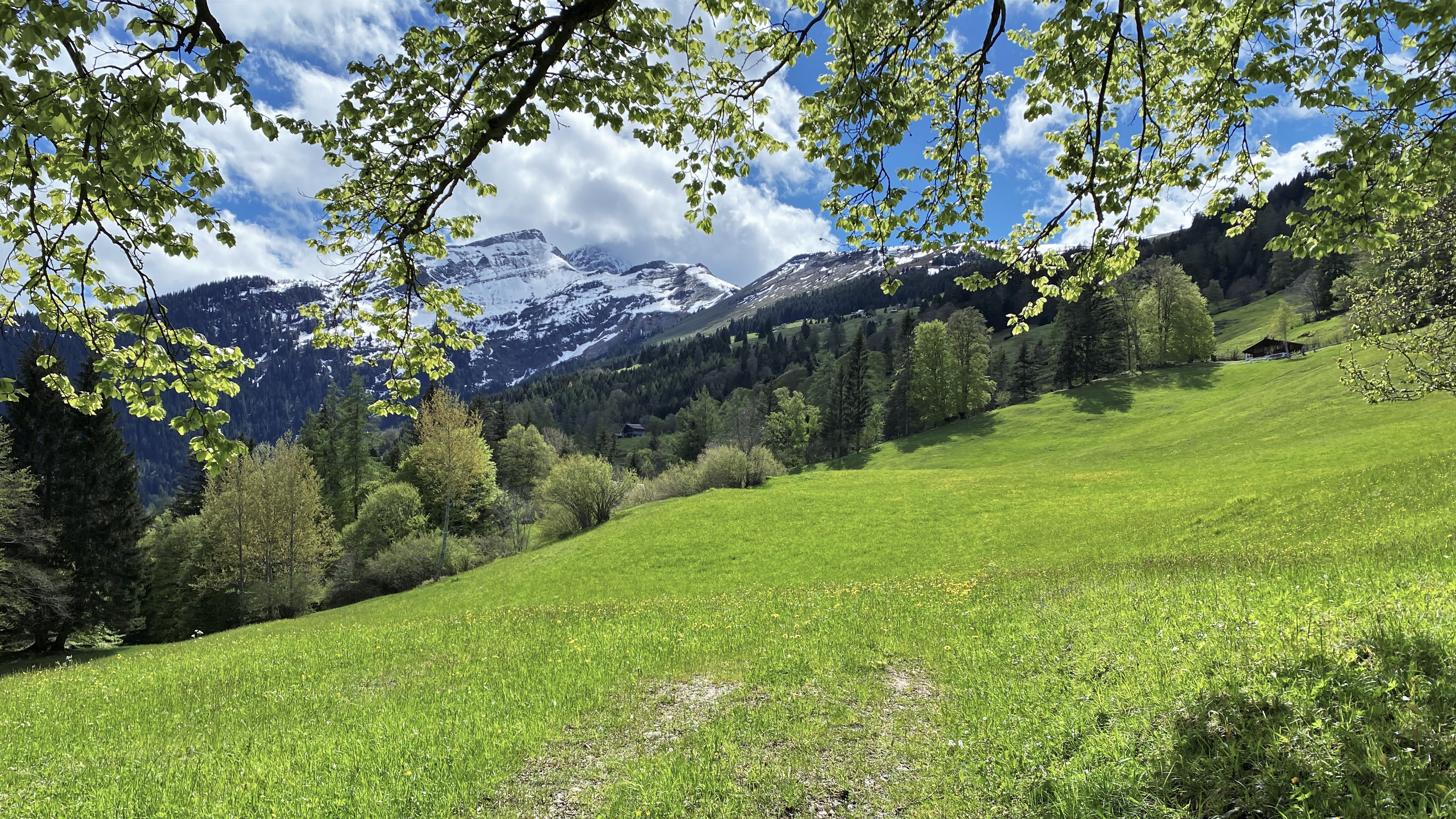 Blick von Süden auf die Bergwiese, oben links im Bild die Alpstrasse in die Oberberge und zur Alp Salaz. Aufnahme von April 2026.