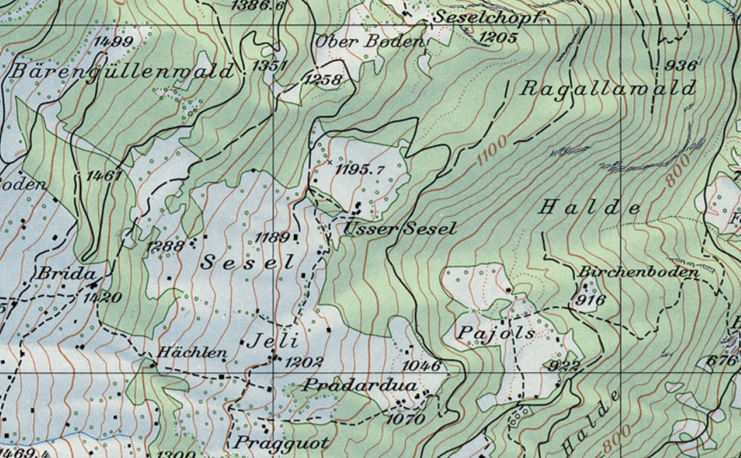 Blick vom Waldrand des Haldawaldes (auf ca. 1.146 m Höhe) nach Südwesten über die 'Ussera Sesel'-Alpe zum Berger Calanda (2.270 m).