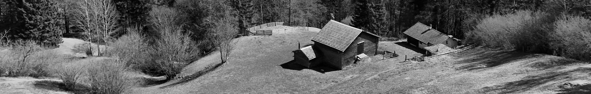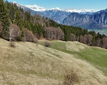 Blick nach Südosten über die Bergwiese hinweg bis zu den verschneiten Bergen der Hochwang. Aufnahme von April 2026.