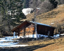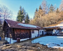 Blick von Nordosten auf die Maiensäss am oberen (westl.) Rand der Bergwiese (Gebäude Nr. 363 auf ca. 1'198 m Höhe. Aufnahme von Anf. Februar 2024.