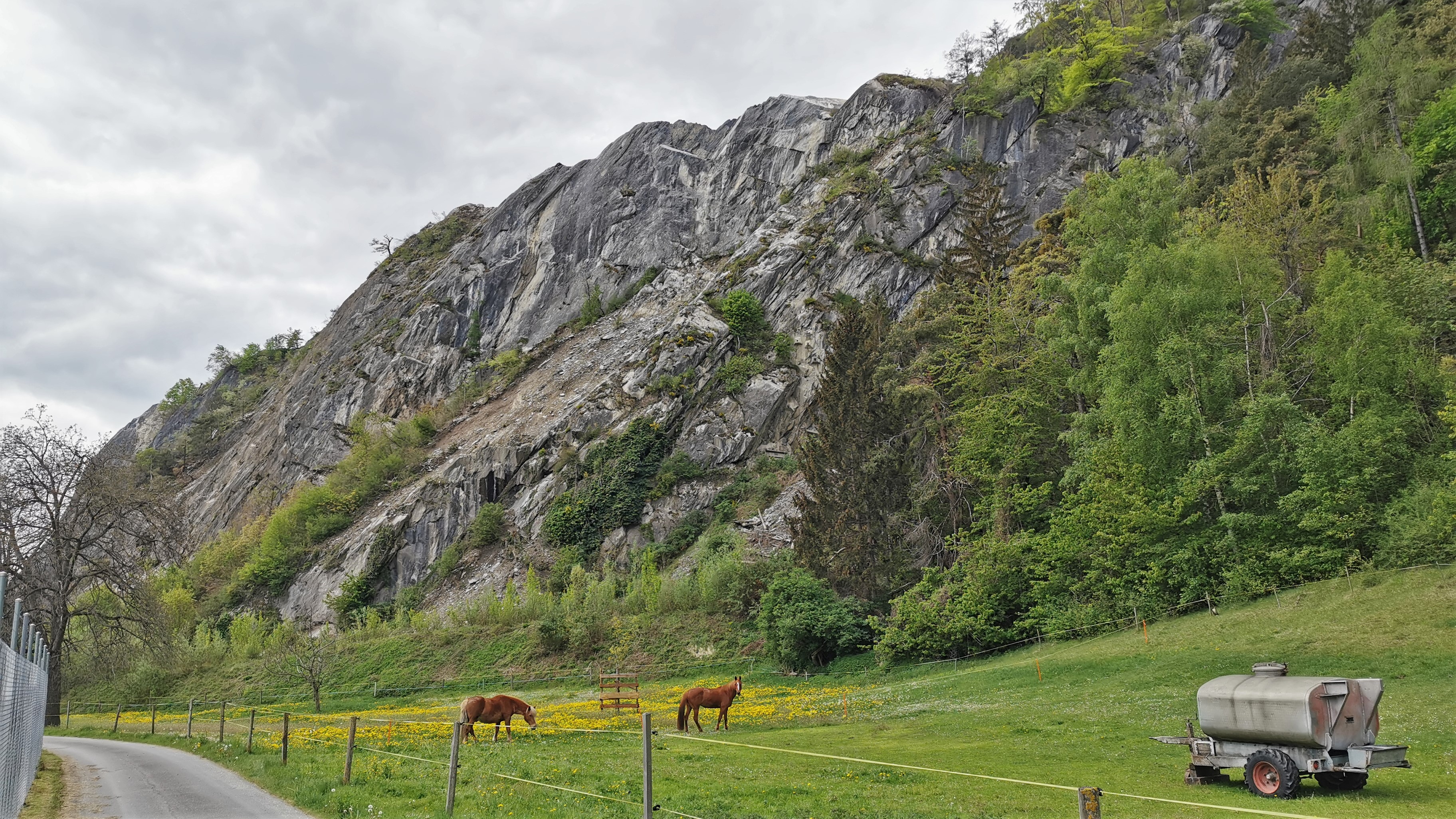 Frühling auf den Weiden vom Burgherteli, im Hintergrund die Abbruchkante des Haselboden-Steinbruchs.
