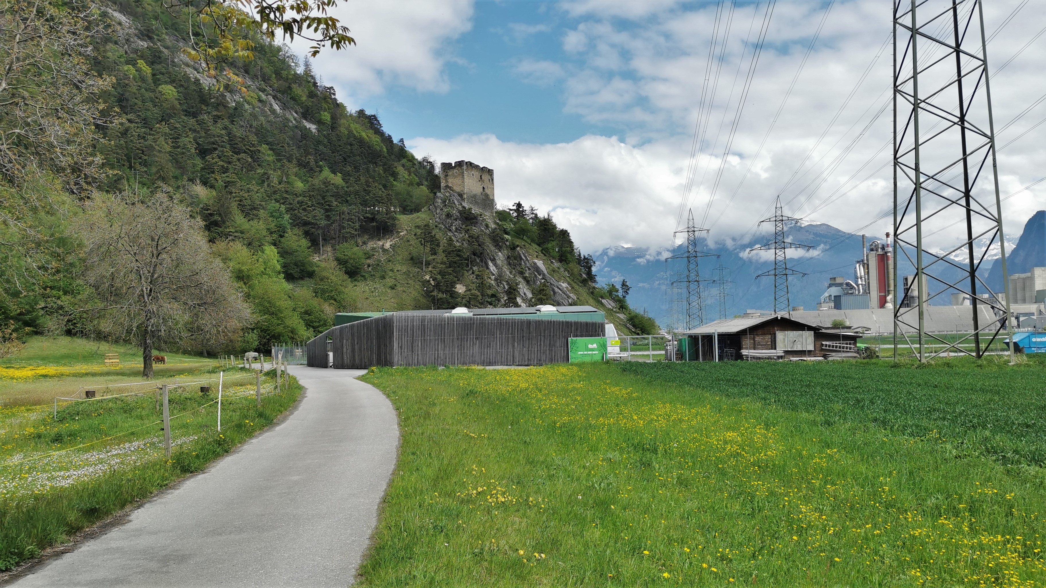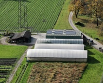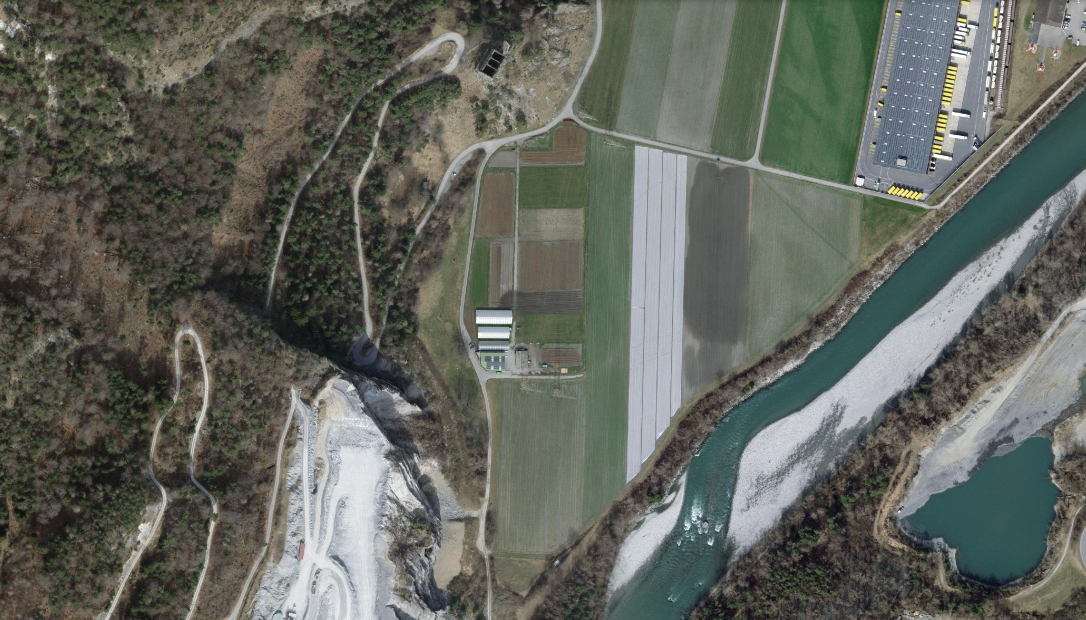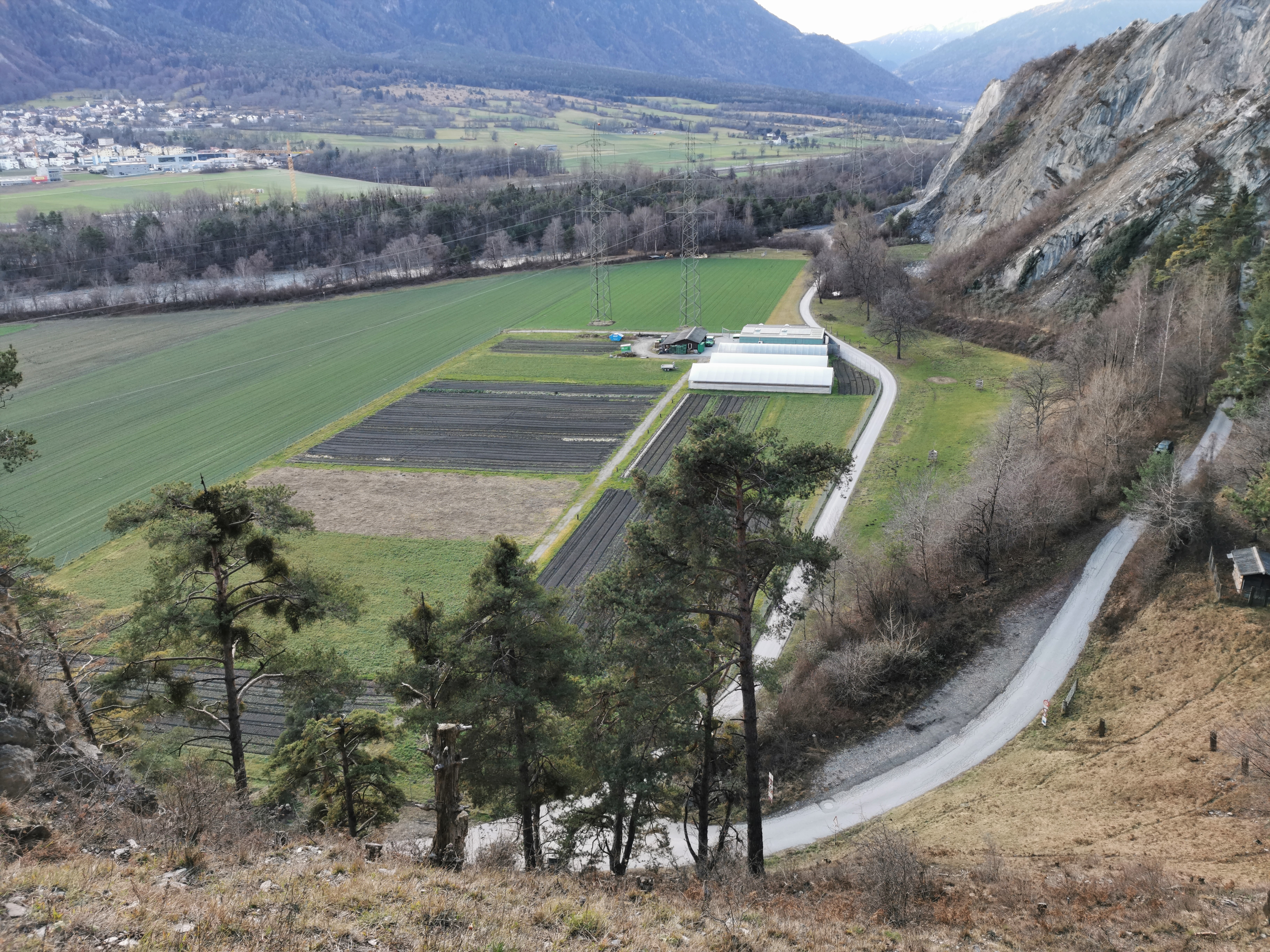 Blick von der Auffahrt zur Neuburg auf den Gartenbaubetrieb am Burgherteli und die dahinter liegenden Gemüsefelder. Darüber aus dem Rheintal aufragend der…