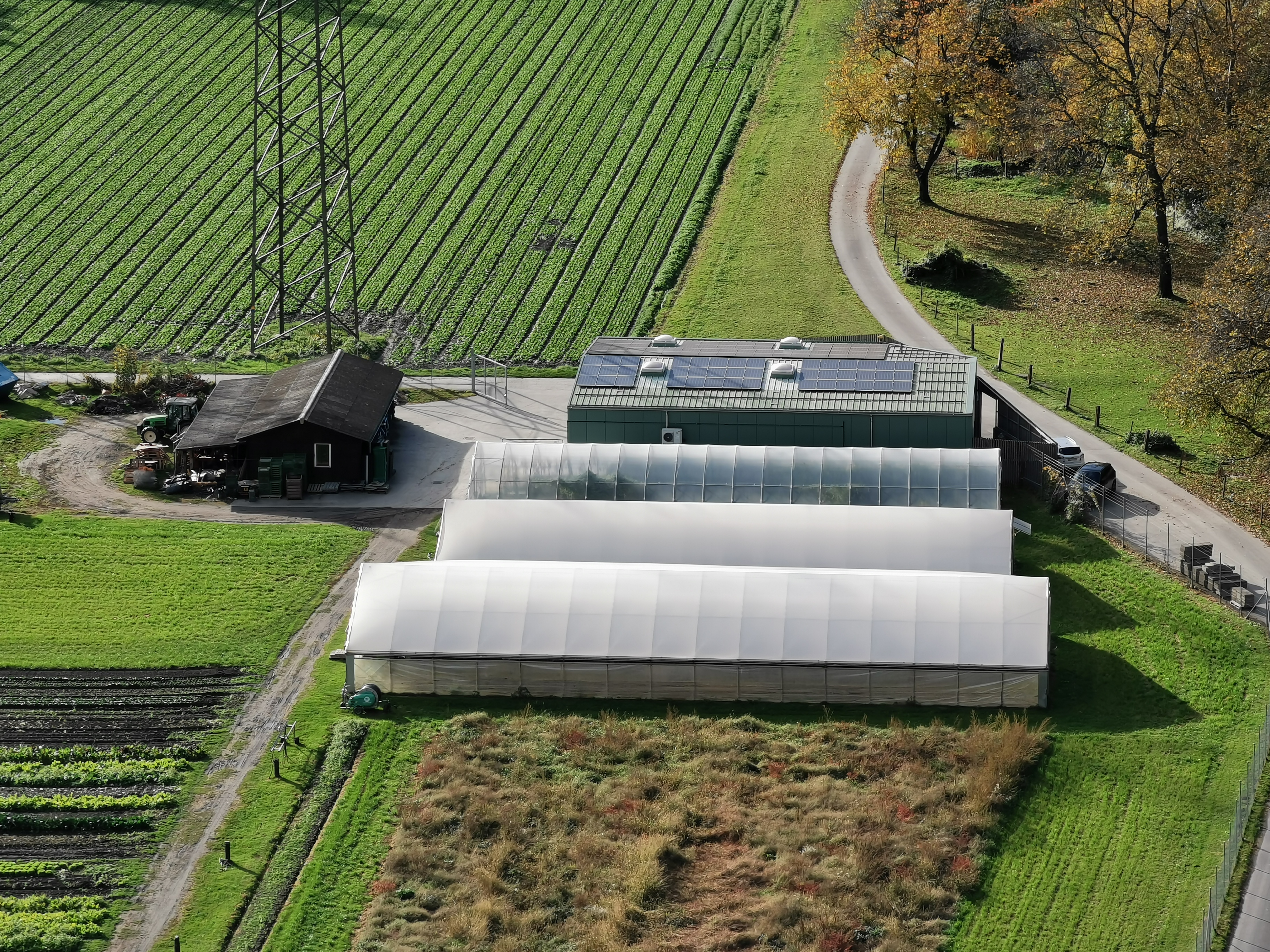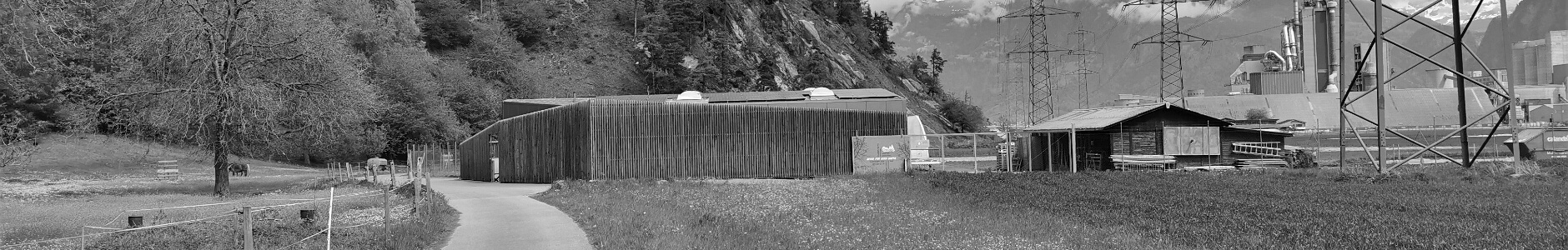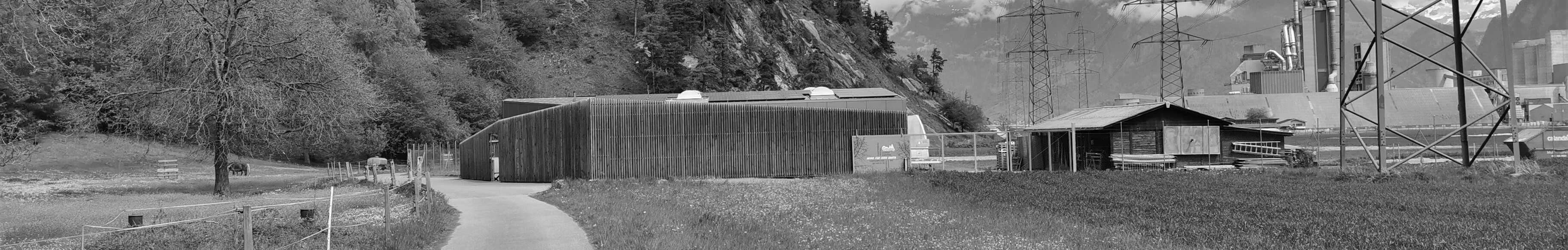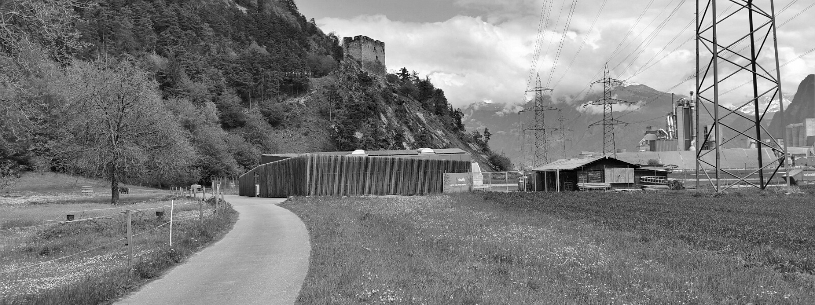 Blick von der Auffahrt zur Neuburg auf den Gartenbaubetrieb am Burgherteli und die dahinter liegenden Gemüsefelder. Darüber aus dem Rheintal aufragend der…