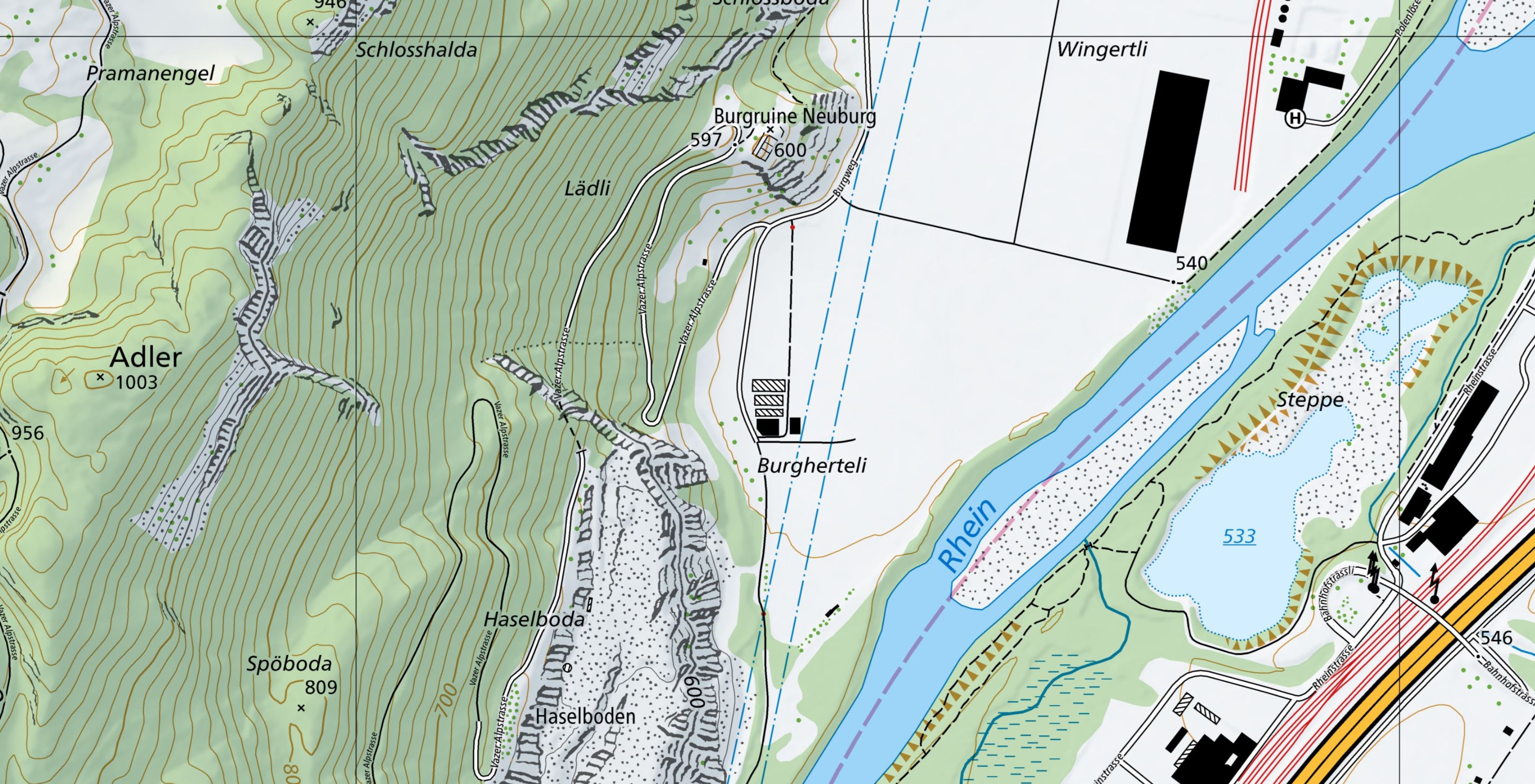 Blick vom Felsen der Neuburg nach Südosten hinab ins Rheintal mit dem Burgherteli und dem dortigen Gartenbaubetrieb.
