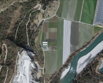 Historisches Luftbild (Juli 1999) von Nordosten auf den Winkel der Untervazer Rheinebene am Burgherteli (540 m), ganz unten die Kiesgrube an der Steppe…