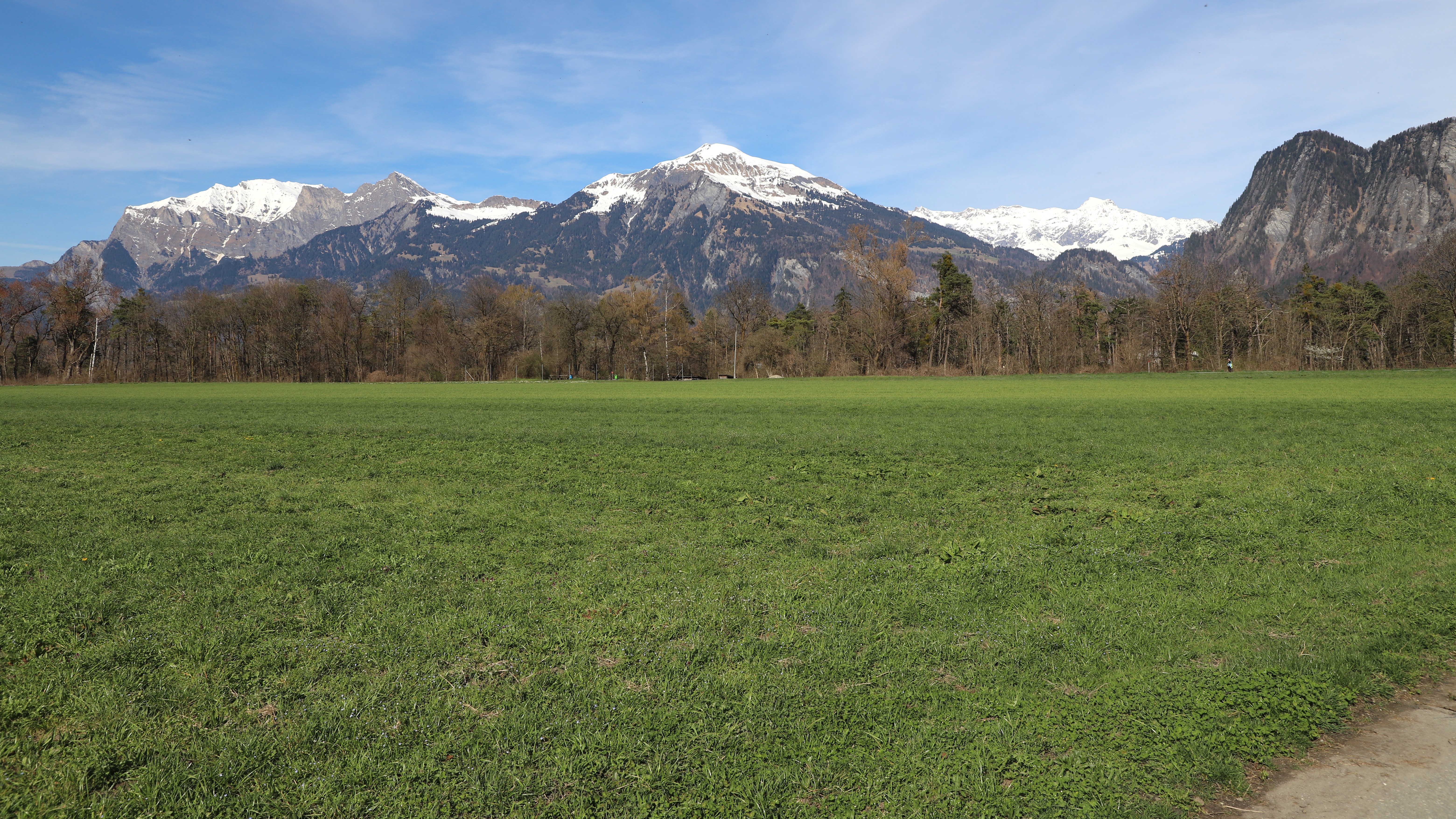 Ausblick im zeitigen Frühjahr bei der Schinderhütta (auf ca. 530 m Höhe) in der Vazer Rheinebene nach Nordosten mit dem Panorama des Rätikons, welches von der…