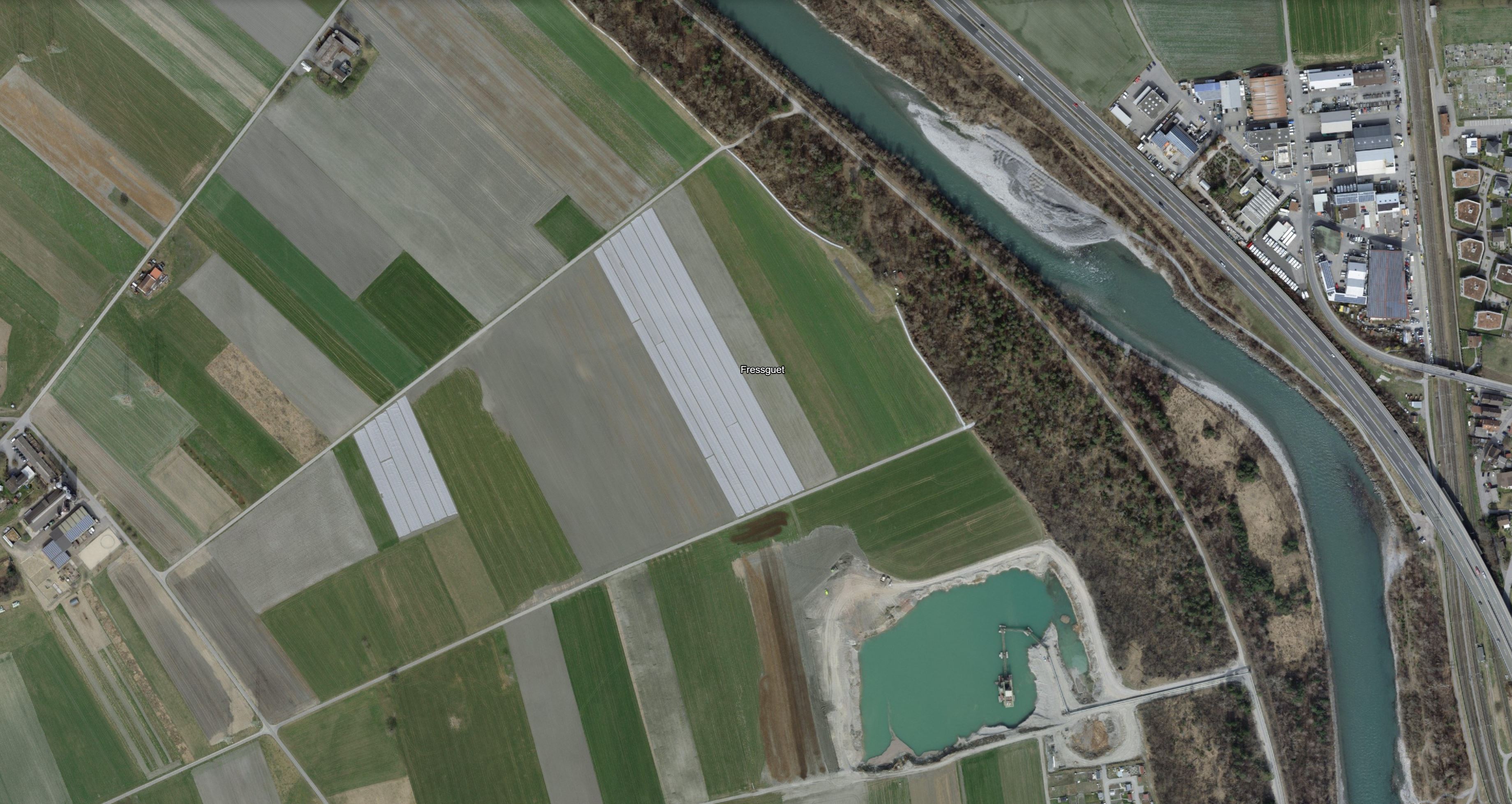 Aufnahme von 1955 aus ca. 5370 m Höhe mit der damaligen Situation an der heutigen Feldflur 'Fressguet'. Sie überdeckt heute die südl. Teile des damaligen…