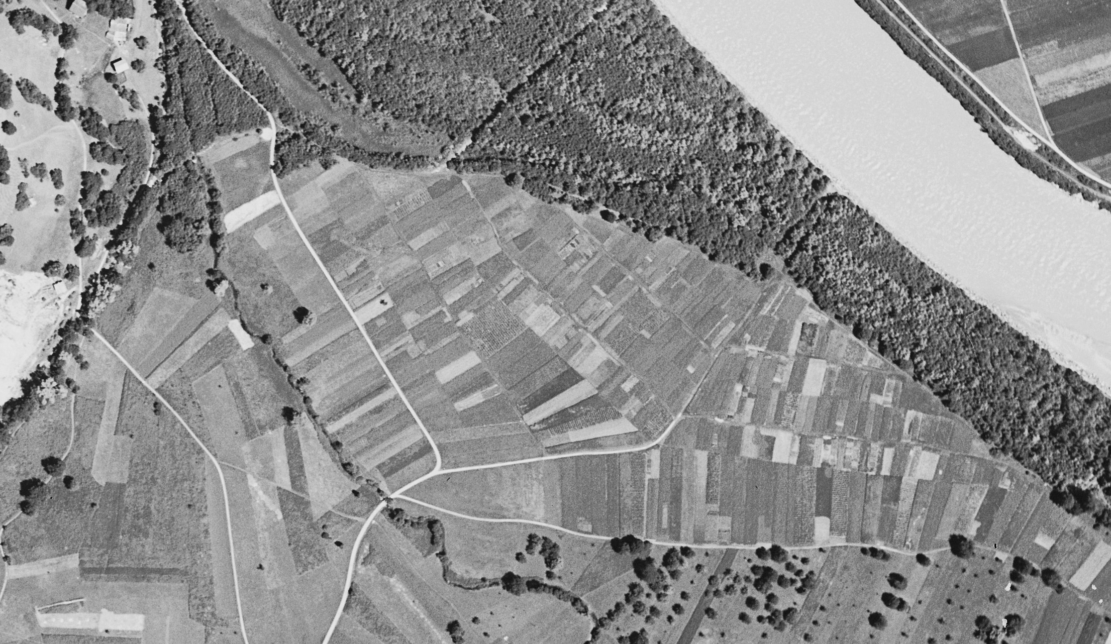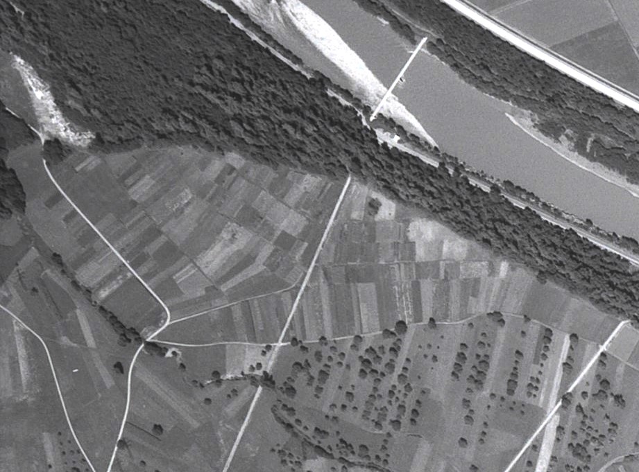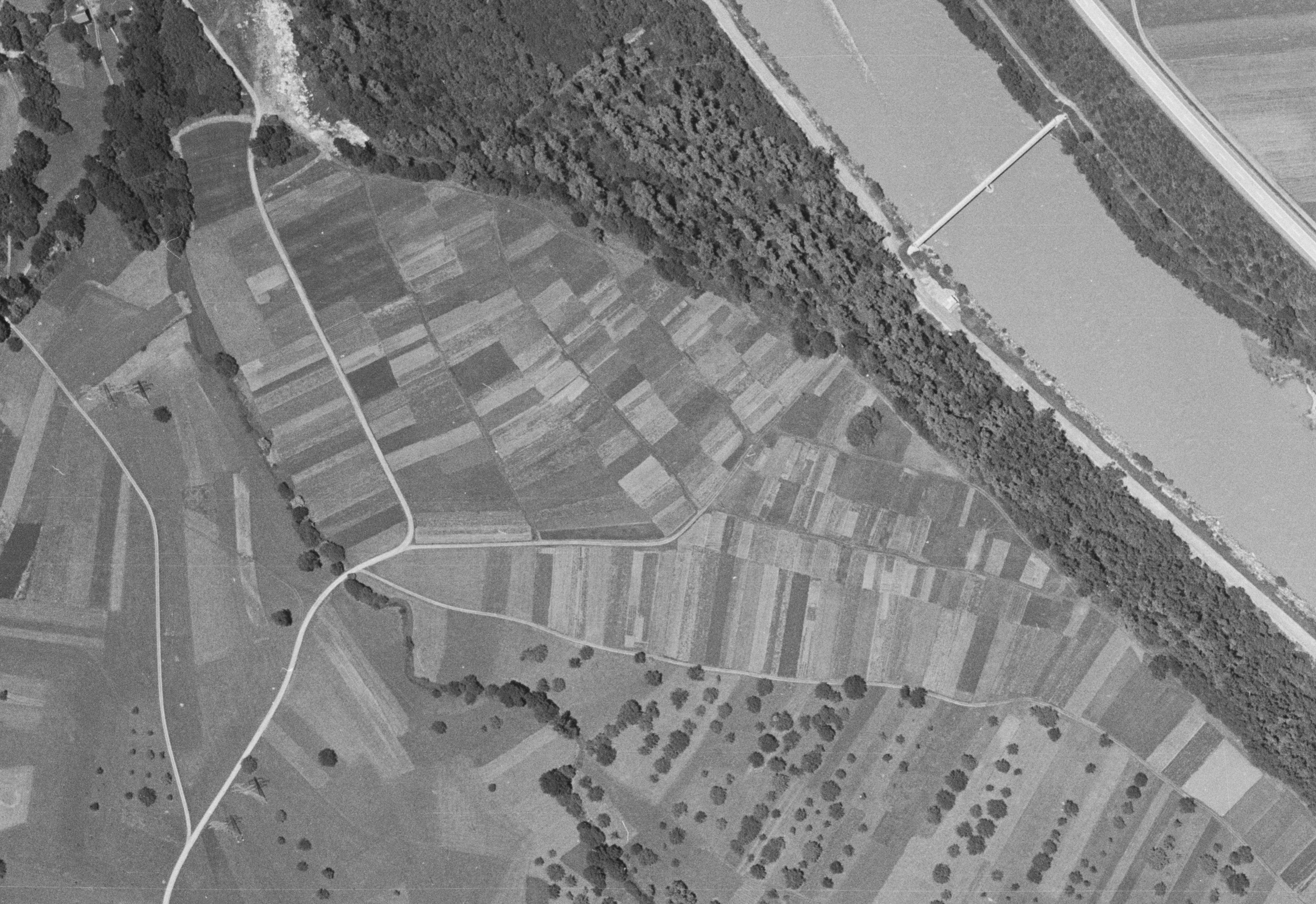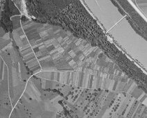 Ausschnitt aus einer Aufnahme von 1940 aus 3.050 m Höhe mit der hist. Flur in der Bildmitte, welche sich deutlich gegen den Auwald (oben im Bild) abgrenzte. Im…