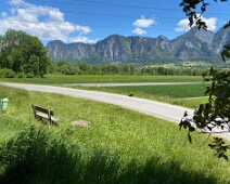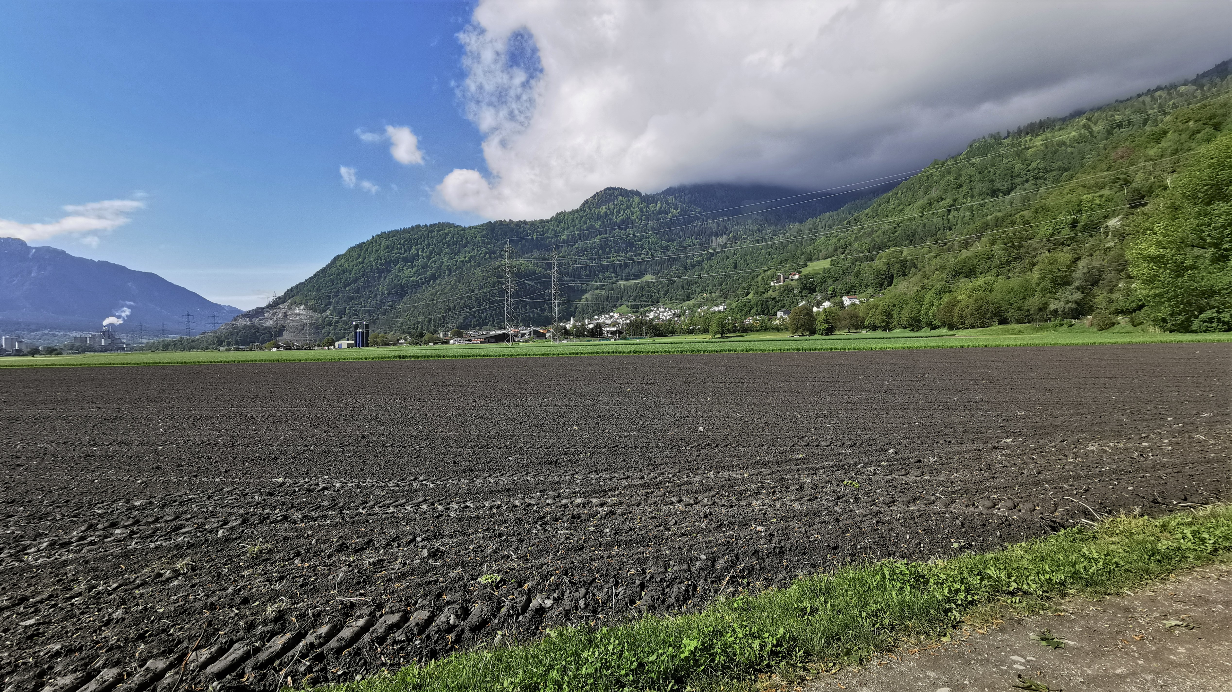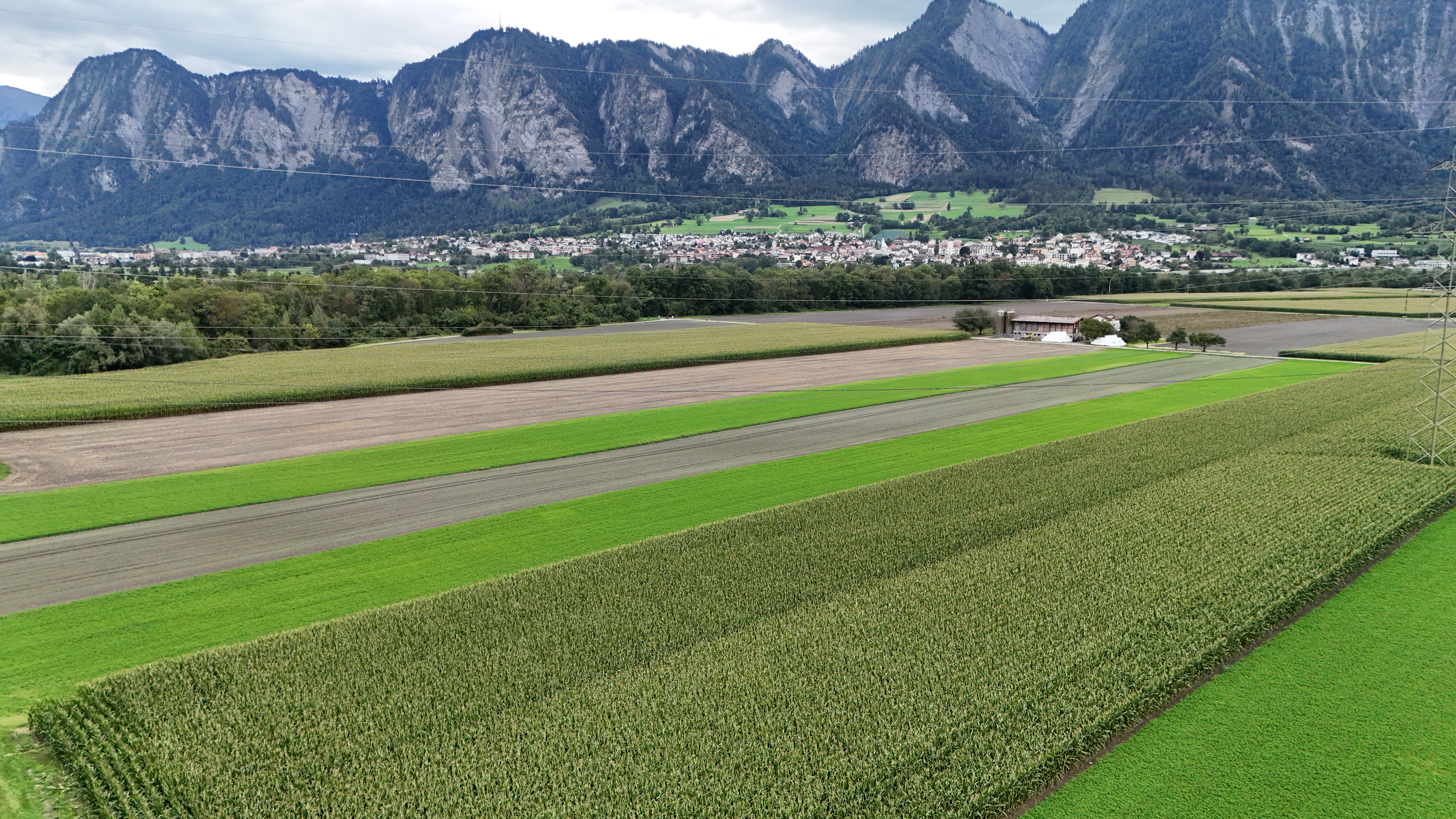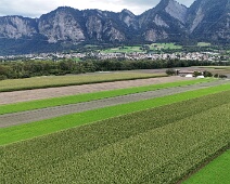 Blick vom Waldrand am Auwald nach Süden über die Feldflur bis nach Untervaz (Bildmitte).