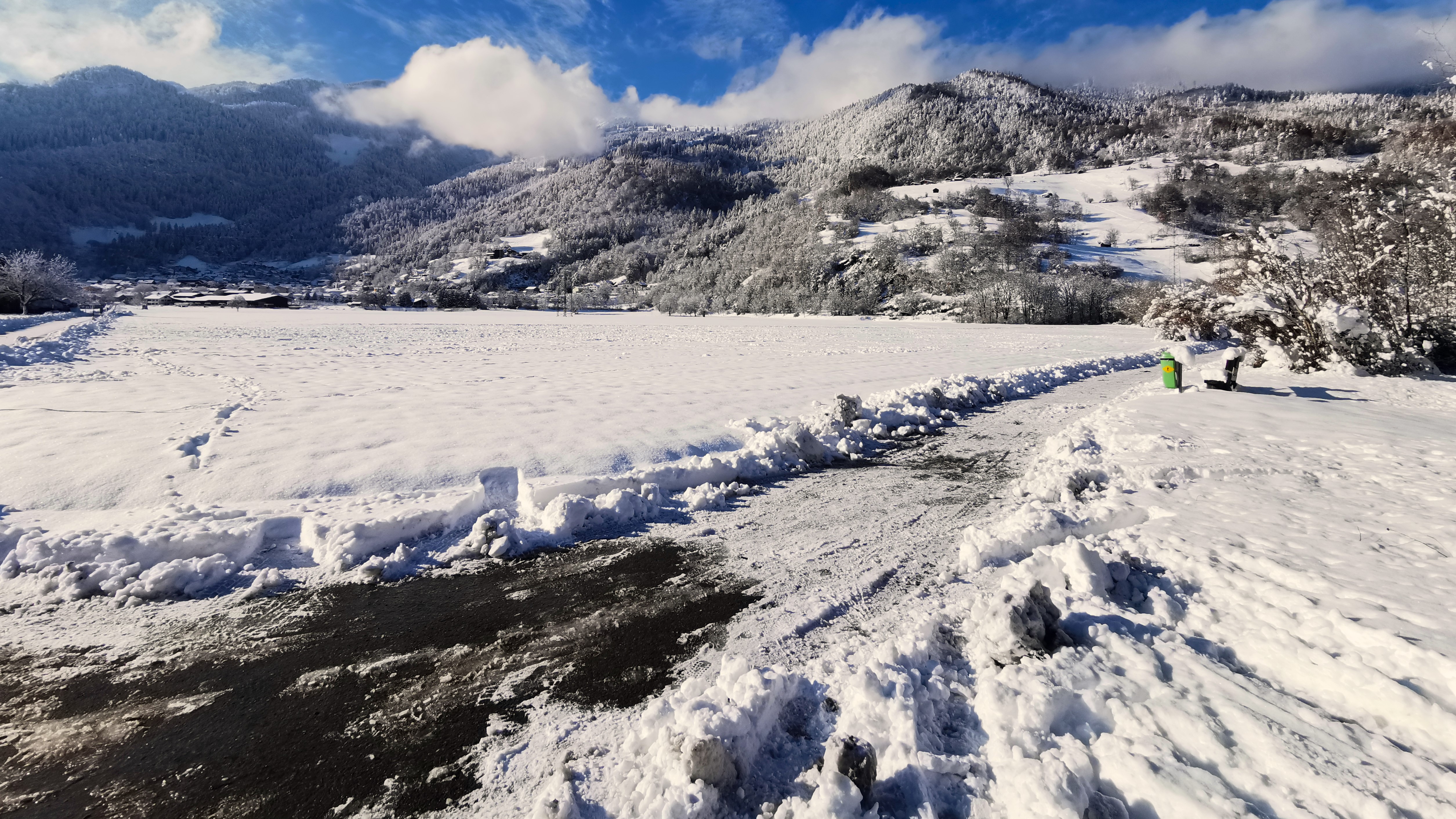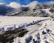 Winterstimmung auf dem Unteräuli, Blick nach Westen auf die teils wolkenverhangenen Calanda-Berge. Links im Talwinkel das im Schatten liegende Untervaz.