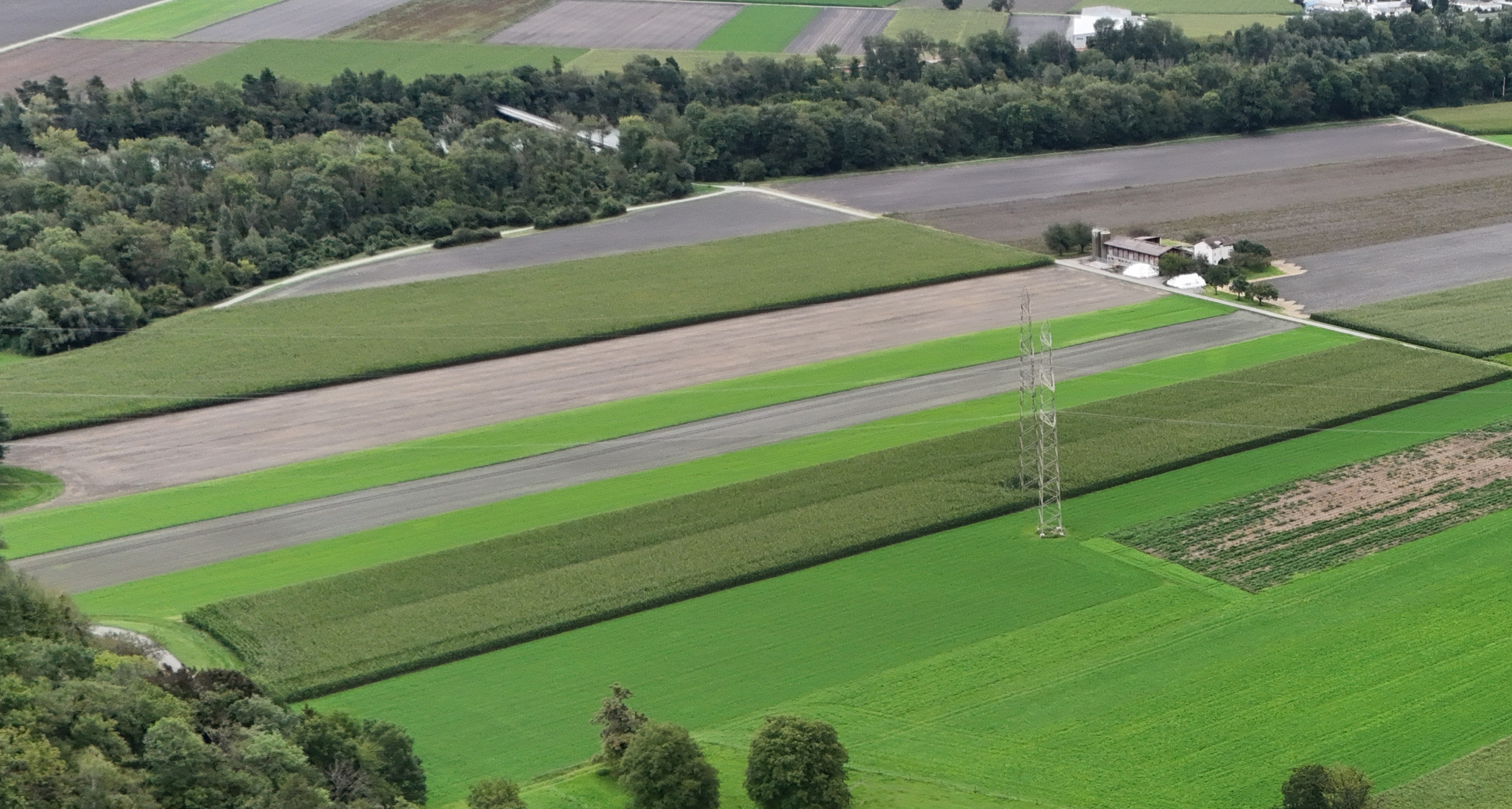 Ausschnitt aus einer Aufnahme von 1967 aus 3.711 m Höhe mit der Flur in der Bildmitte. Oben rechts im Bild die Oleodotto-Brücke über den Rhein. Eine der letzten…