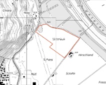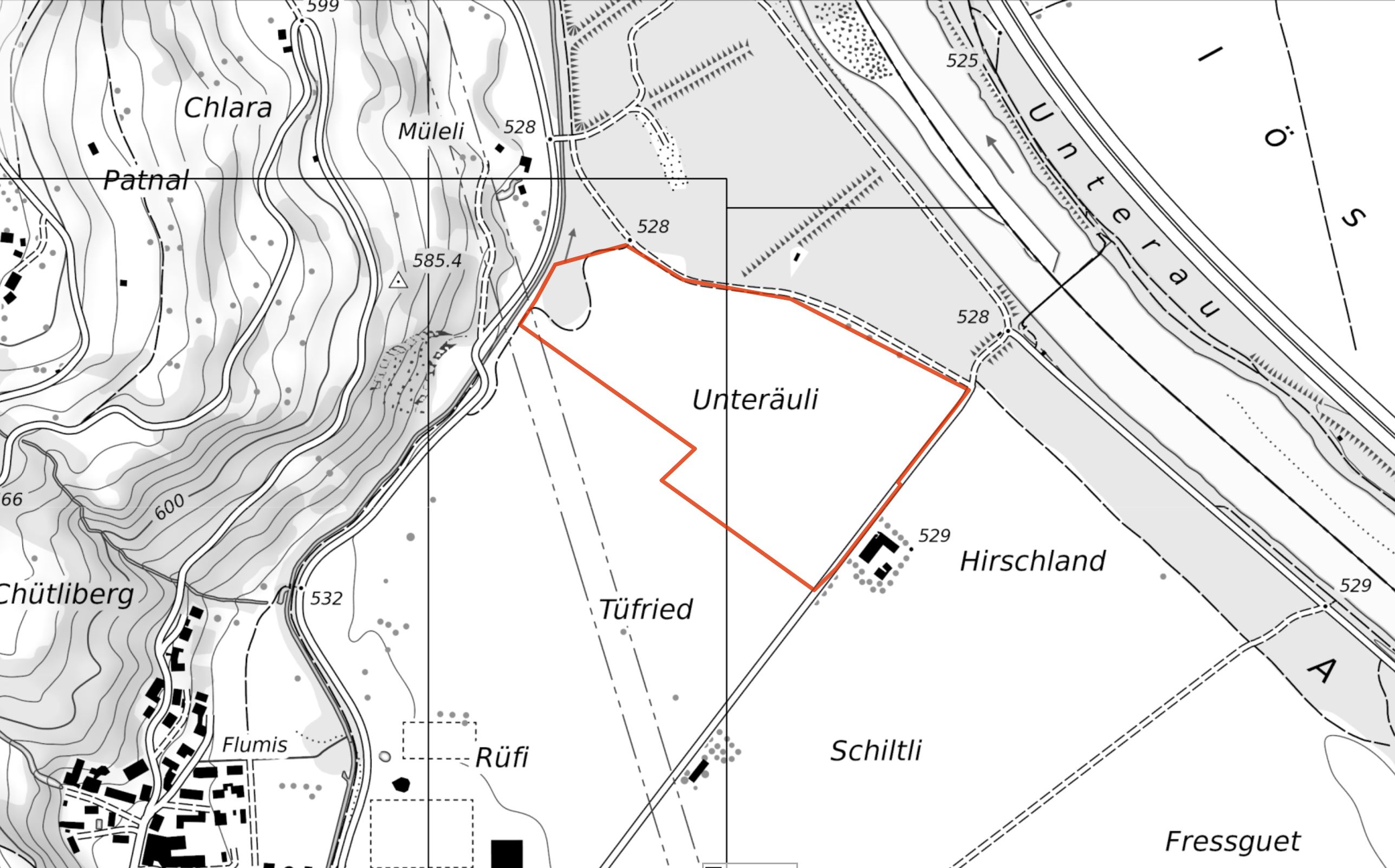 Blick von Westen auf die Flur (Bildmitte) mit dem Unteräuli-Gehöft (rechts im Bild auf der Hirschland-Flur).