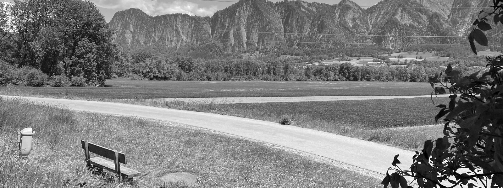 Blick vom Damm des Cosenzbaches nach Nordosten über Teile der Unteräuli-Flur hinweg zum Waldrand der Rheinauen. Dahinter aufragend, auf der gegenüberliegenden…