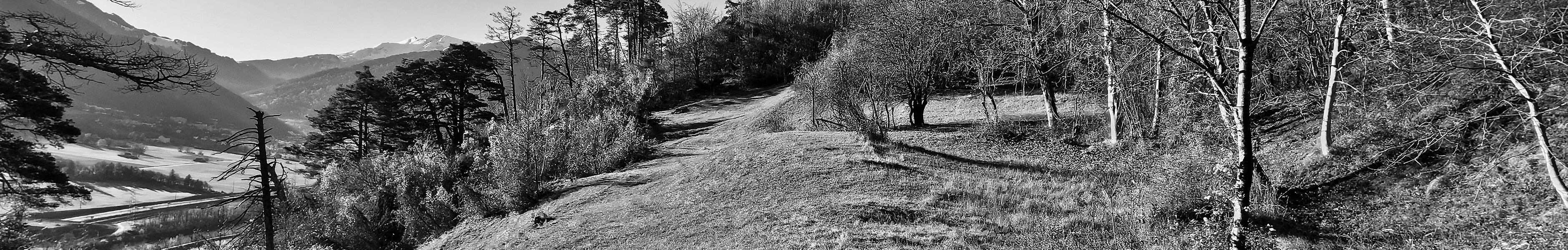 Blick vom oberen Ende (auf ca. 698 m Höhe) über die Bergwiese hinweg nach Nordosten. Links der Bildmitte der schneebedeckte Vilan, rechts der Bildmitte der…