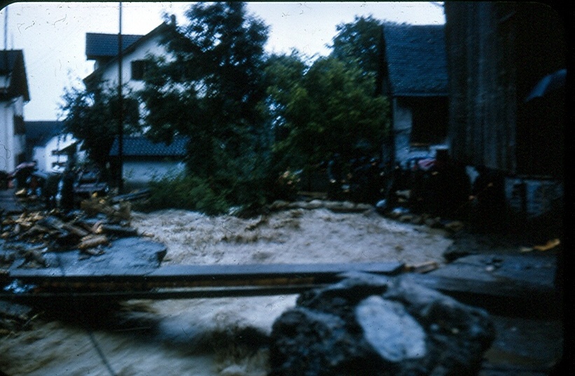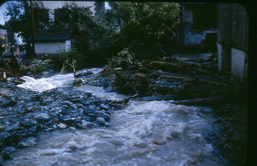 Der Soldambach, wo die Rohrleitung von Vogel Anton bis Insel verstopft wurde und der Bach mit aller Wucht sich über die Strasse ergoss.