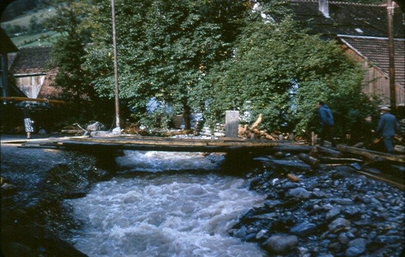 Blick nach Südwesten aus der oberen Sala zur weggeschwemmten Bädersbrücke sowie ein Stück den Stotz hinauf. Für den provisorischen Bachübergang waren Holzstege…
