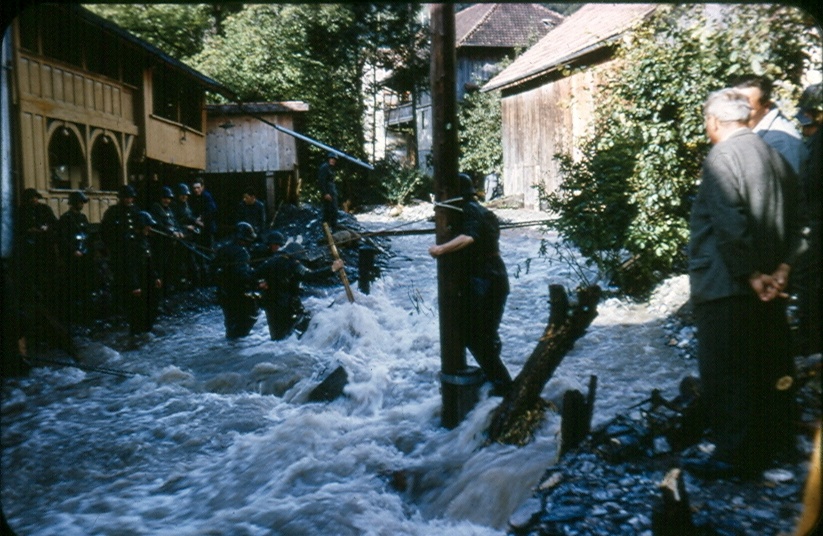 Ob der Bädersbrücke wurde mit dem Trax das Ufer gegen Lehrer Joos geöffnet. Der Bach stürzt ins Bachbett und links in die Sala. Hinter dem Baum das Gebäude vom…