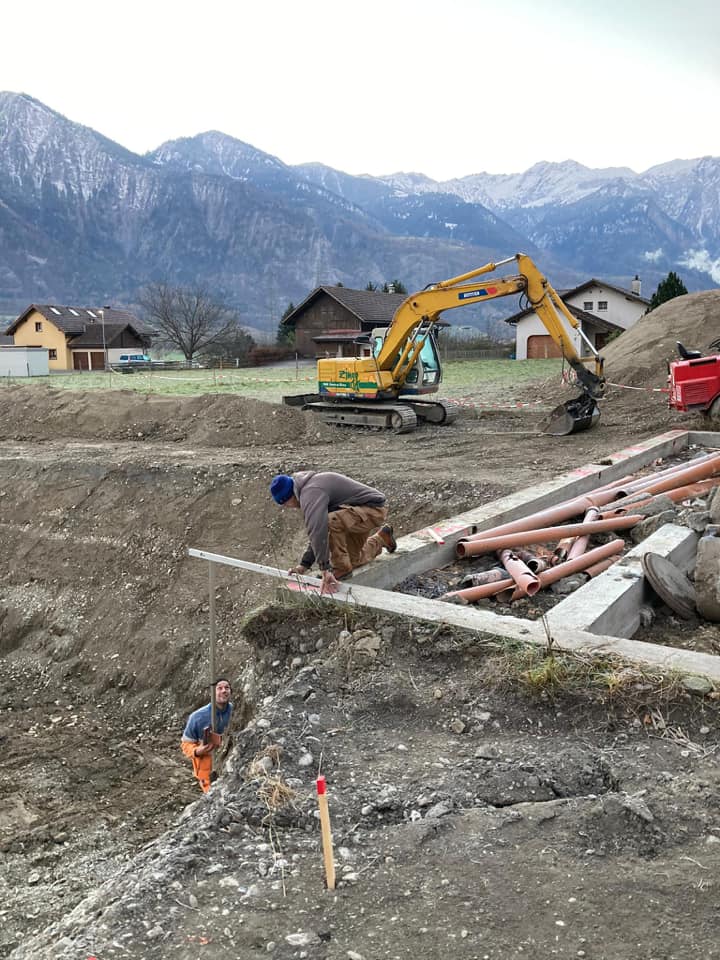 Nov. 2020: Arbeiten an der Baugrube (Südwestecke), Vorbereitung Fundament. Im Hintergrund die Häuser am Gravis, darüber die Berge vom Hochwang.