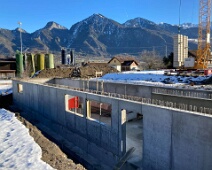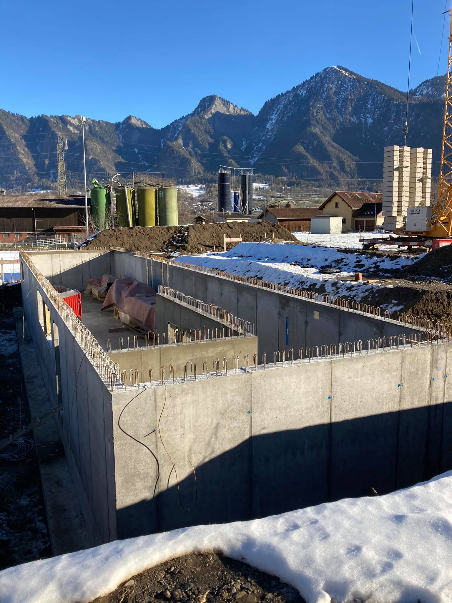 Dez. 2020: Rohbau halbseitiges Kellergeschoss, Blick nach Südosten. Dahinter die Gebäude am Gravis, im Hintergrund die Hochwang-Berge