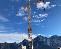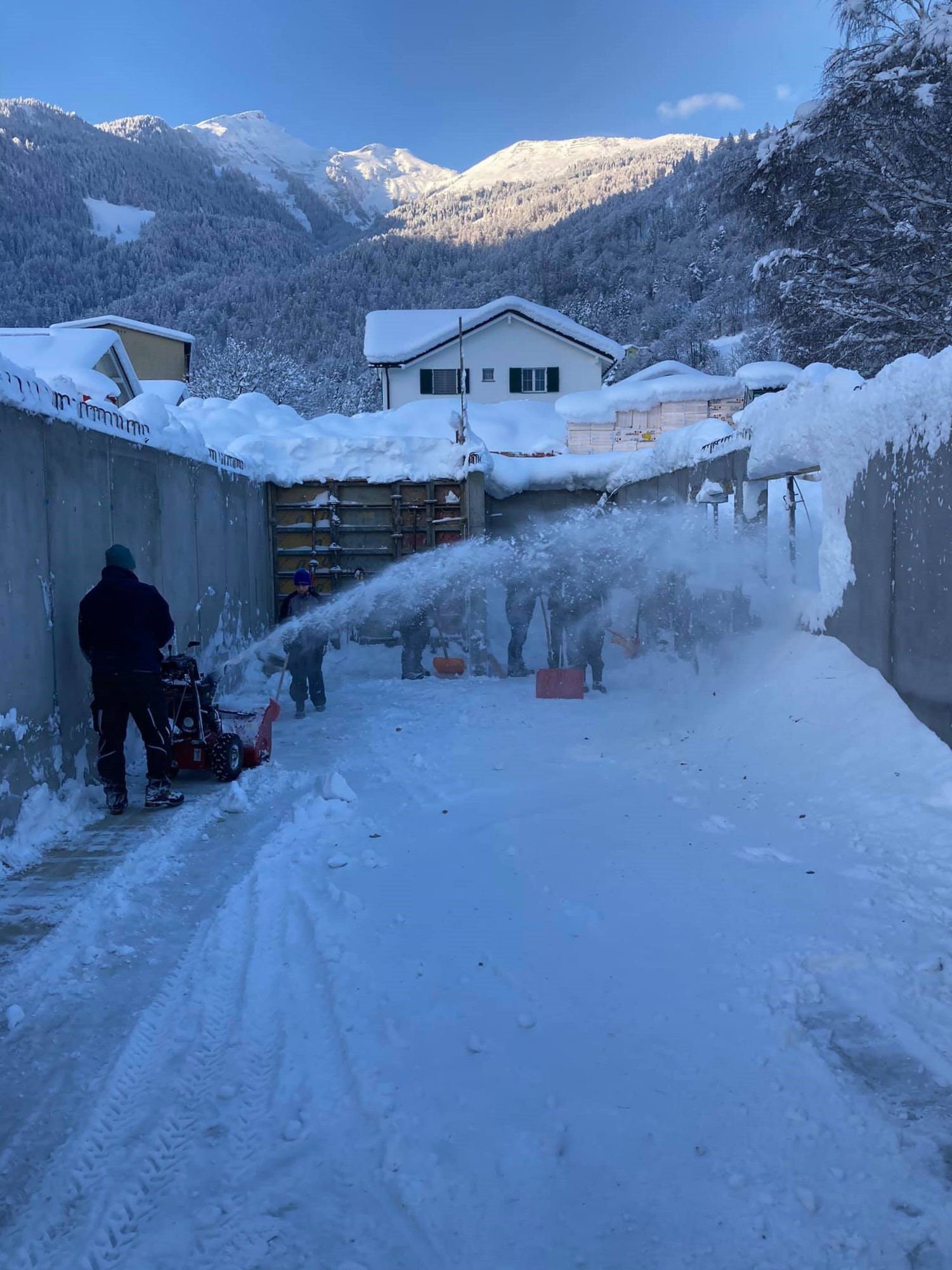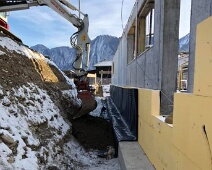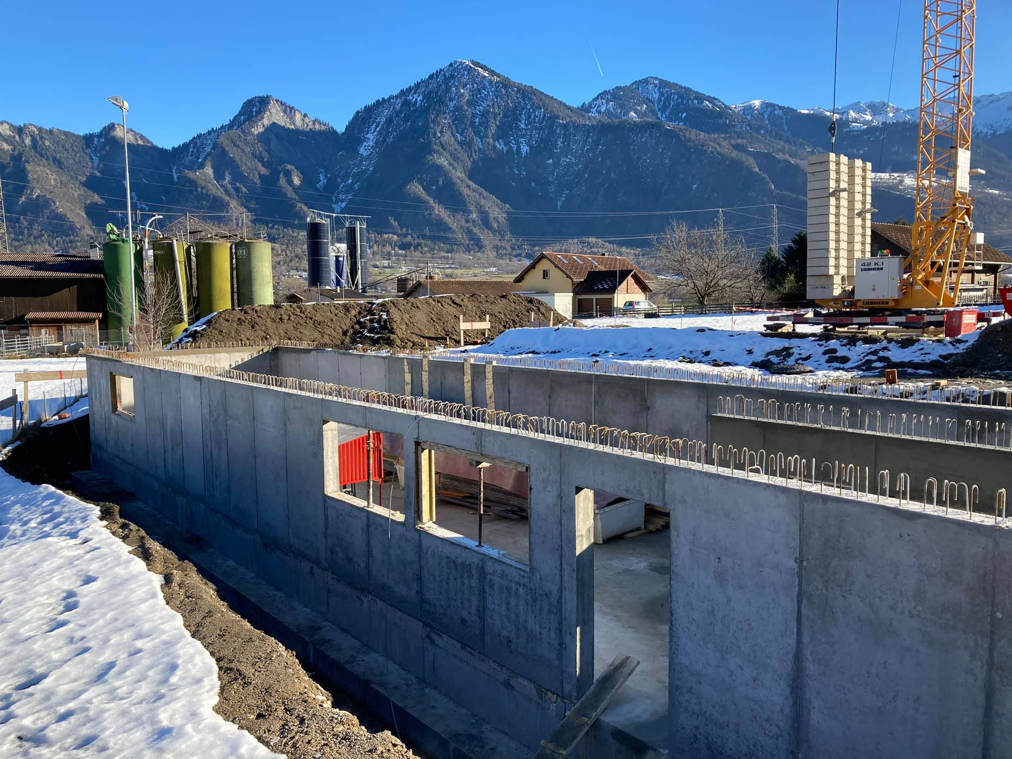 Mitte Jan. 2021: Schneeräumung auf der Baustelle im noch offenen Kellergeschoss. Im Hintergrund die tief verschneiten Berge mit Berger Calanda (links),…