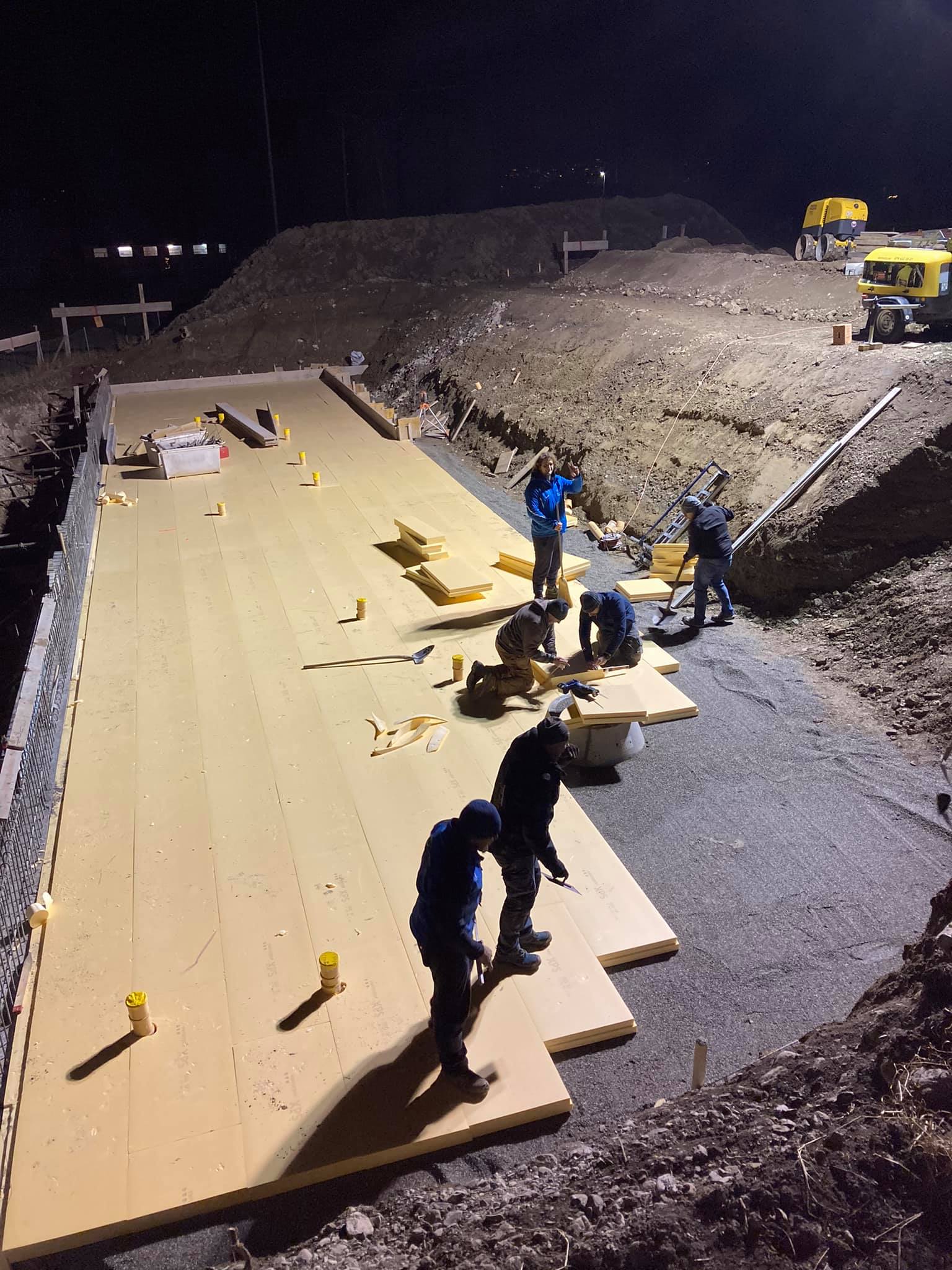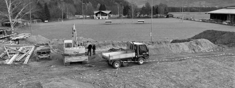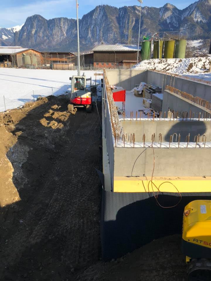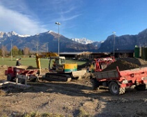 Ende Nov. 2020: Einbringung der Bodenisolation. Blick nach Norden, dahinter ein Teil des Sportplatzes Untervaz.