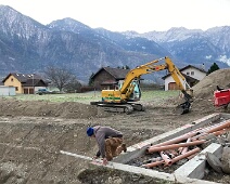 Nov. 2020: Aushub Baugrube, Vorbereitung Fundament, Blick nach Nordosten zu den Bergen des Rätikon. Hinter der Baustelle der Sportplatz Untervaz,
