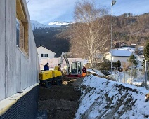 Anf. Jan. 2021: Fertig montierte Wandisolation an der Aussenwand des Kellergeschosses (Nordseite). Beginn der Verfüllarbeiten. Blick nach Westen, im Hintergrund…