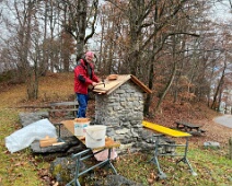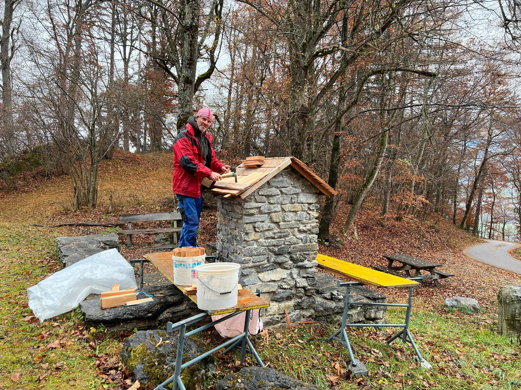 Patrik Stäger bei der Neueindeckung des Holzschindeldachs des Altarsteins der Kapelle.