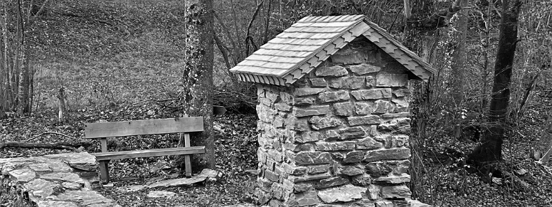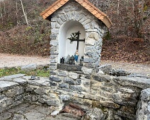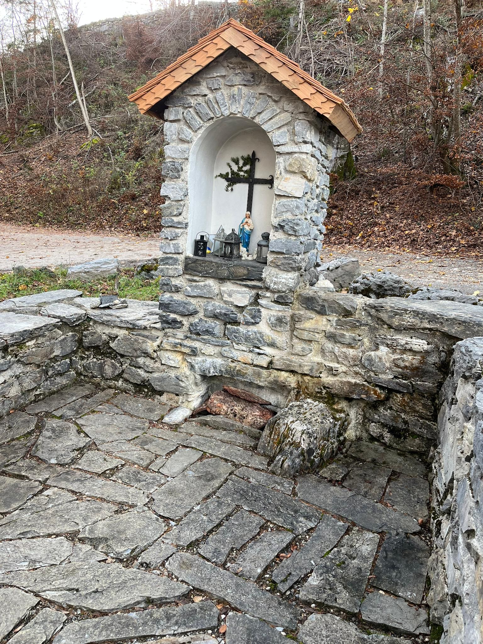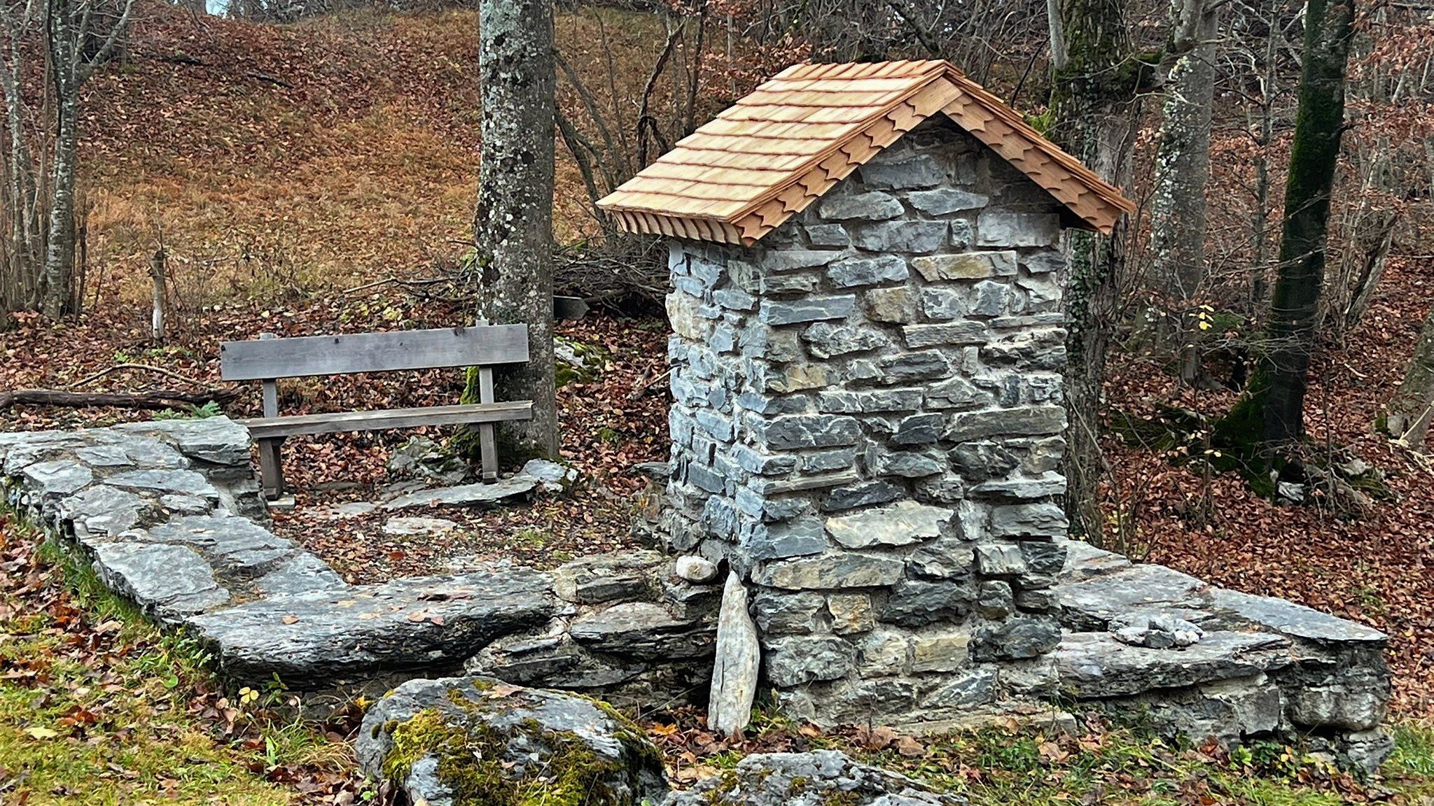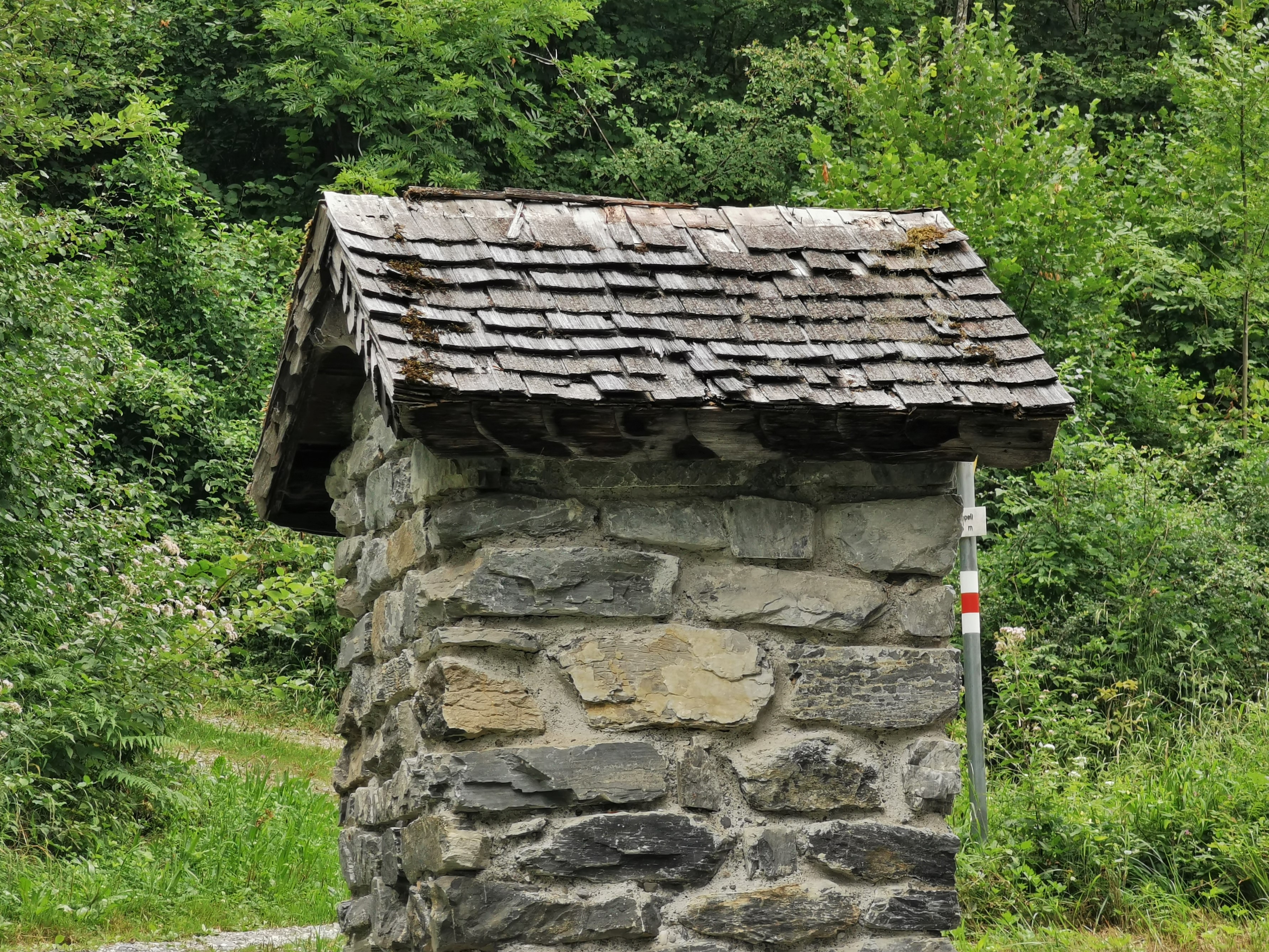 Blick auf den Altarstein der kleinen Kapelle mit dem frisch renovierten Schindelholzdach.
