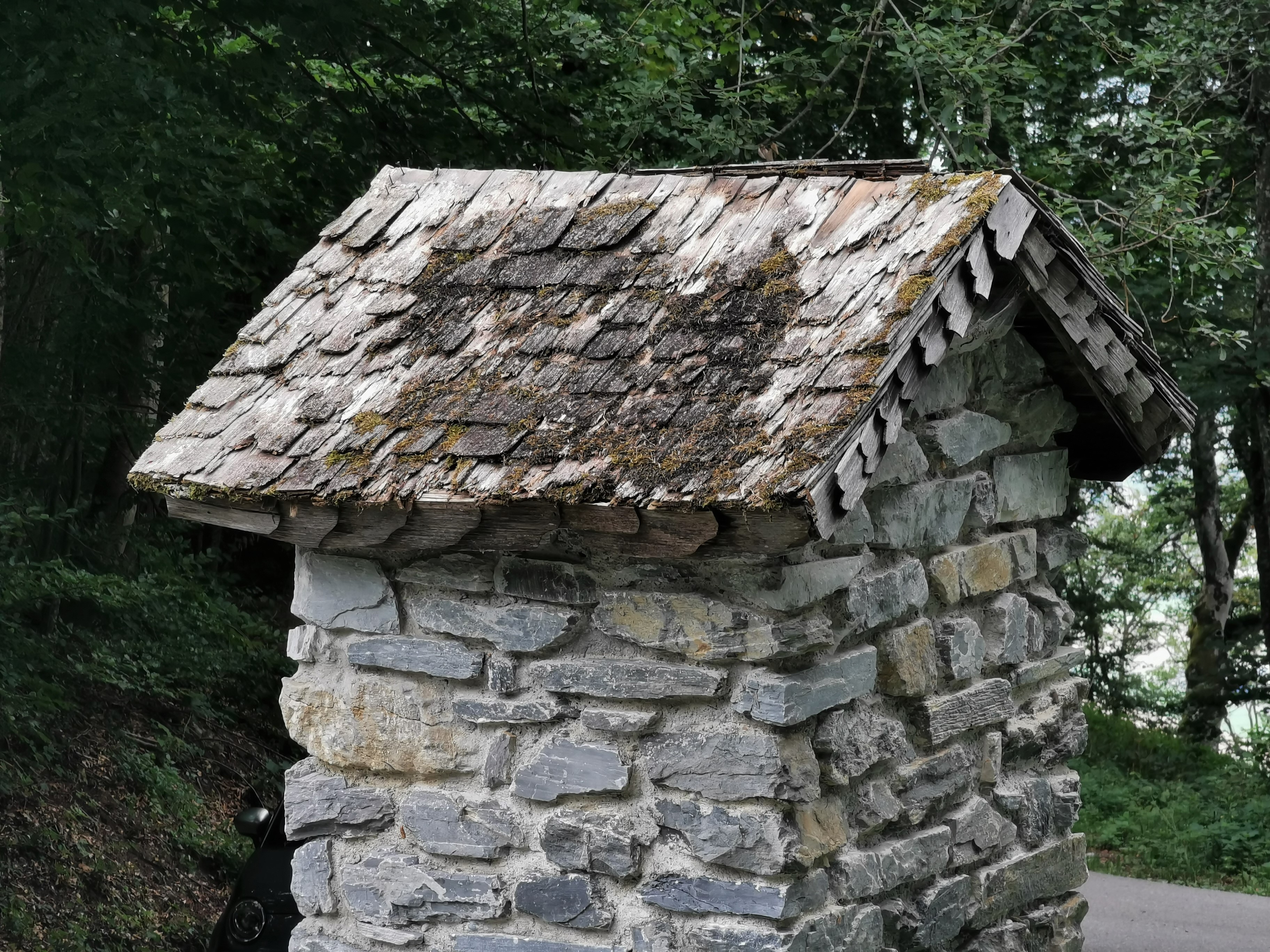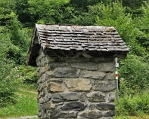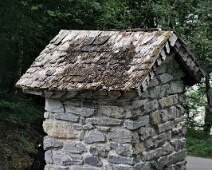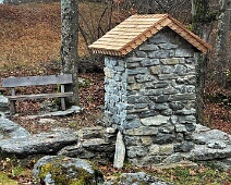 Blick von Westen auf die Rückseite des Altarsteins mit dem erneuerten Schindelholzdach.