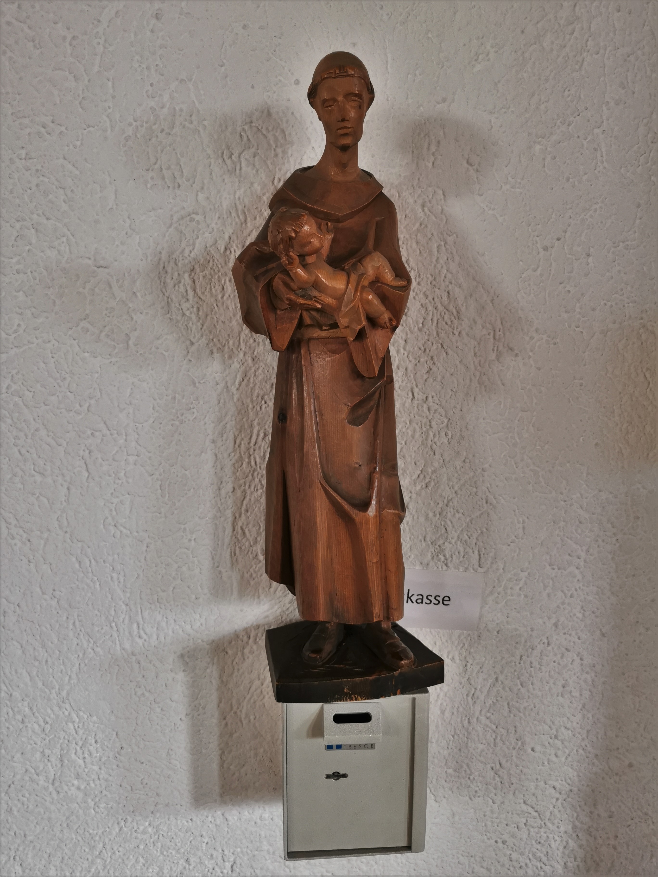 Wandmontage (Hl. Antonius) mit Spendenkasse darunter, angebracht im Innenraum der Kirche hinten rechts (Nordseite).
