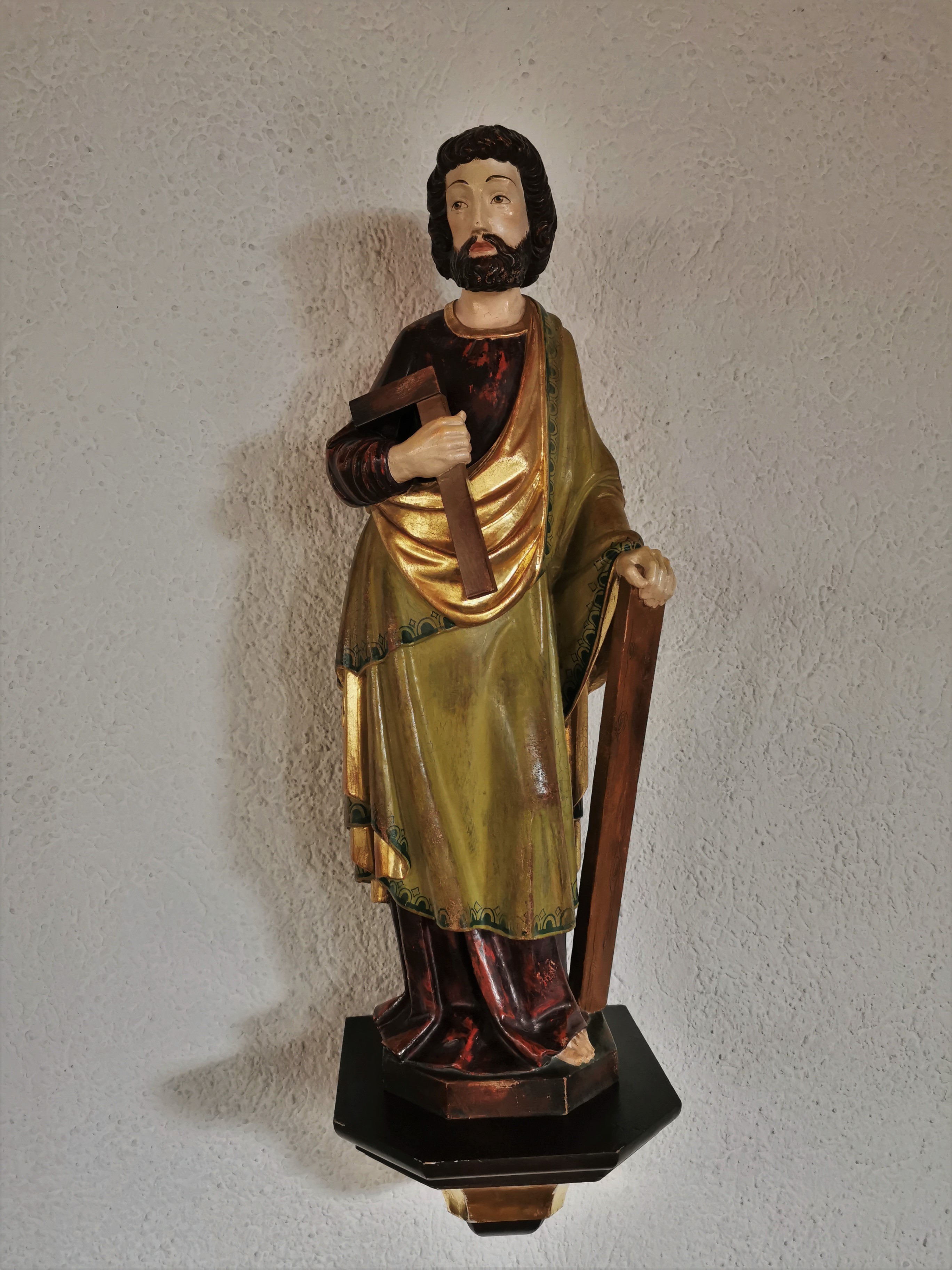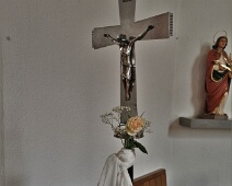 Kruzifix, Jesus-Skulptur wahrscheinlich gleiche Herkunft wie die sog. Plattner-Madonna, Wandmontage im Altarraum (Apsis). Darunter der Altarstein mit dem…