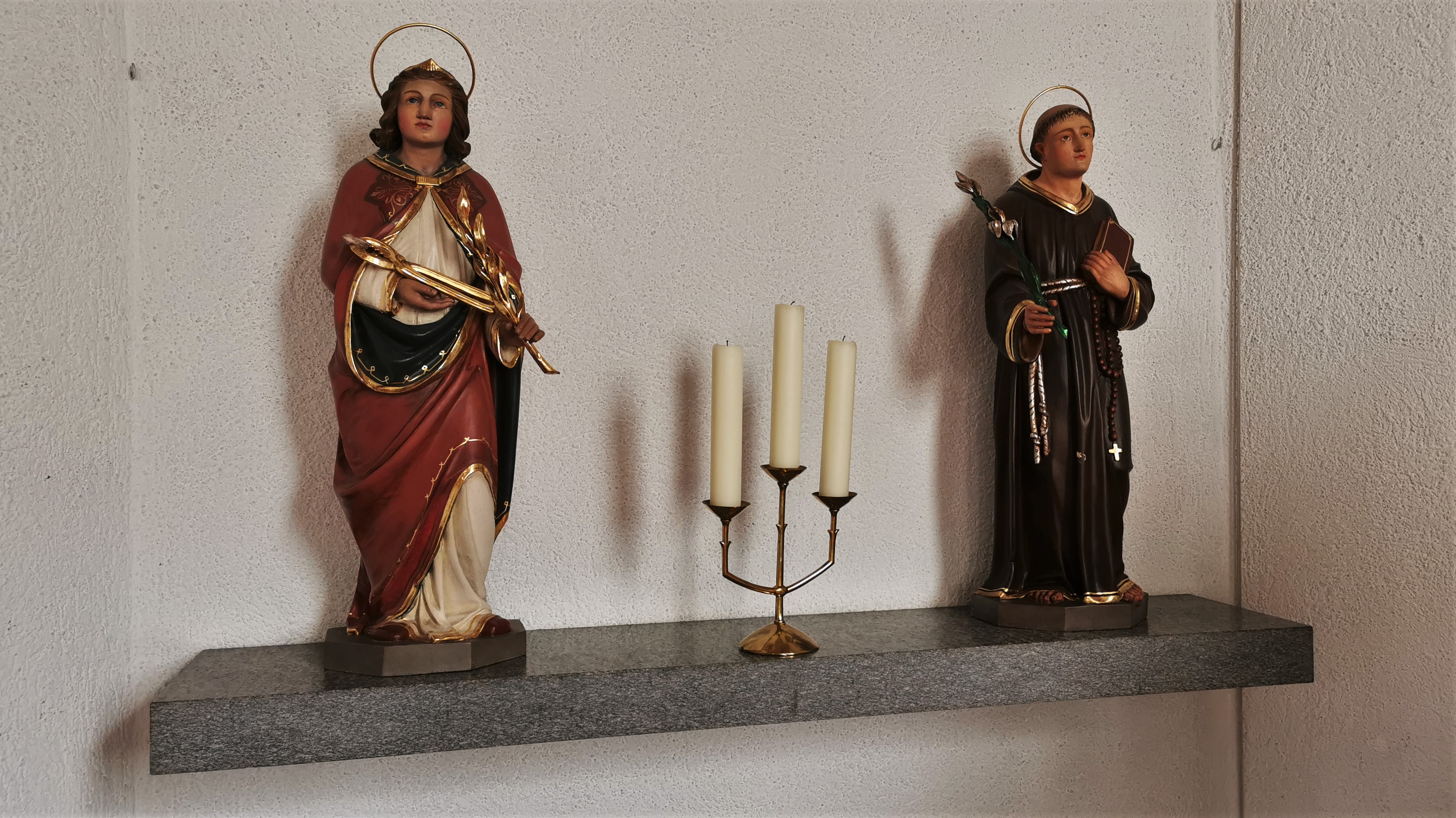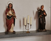 Links: Hl. Appolonia (Patronin gegen Zahnschmerzen); rechts: Hl. Antonius von Padua; Standort Altarraum hinten links.