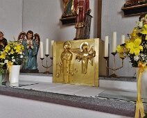 Goldener Tabernakel, aufgestellt 1957, gefertigt v. Werkstätte für Kirchliche Metallkunst, St. Gallen; Standort: Altarraum hinten Mitte unter dem Kreuz
