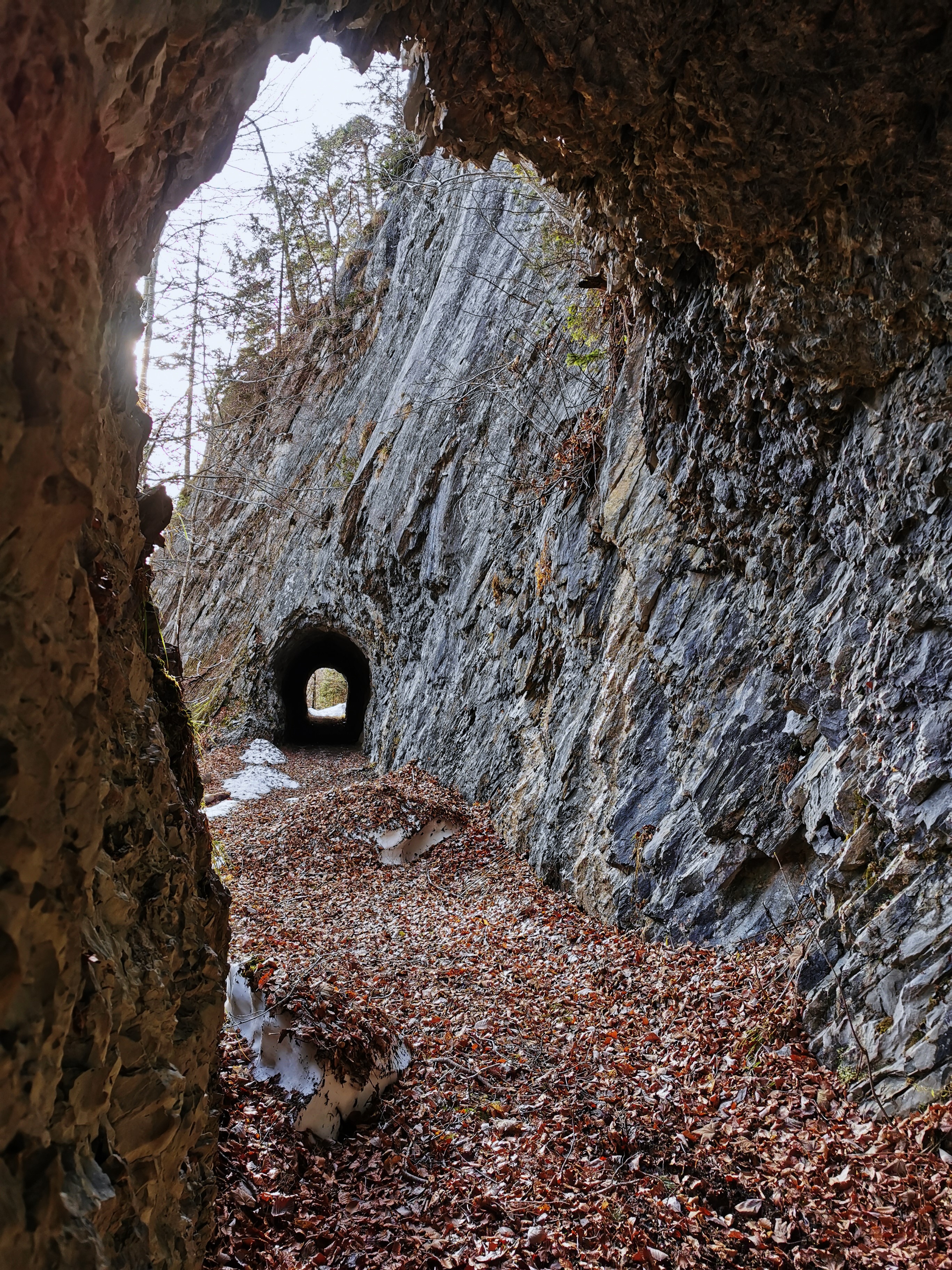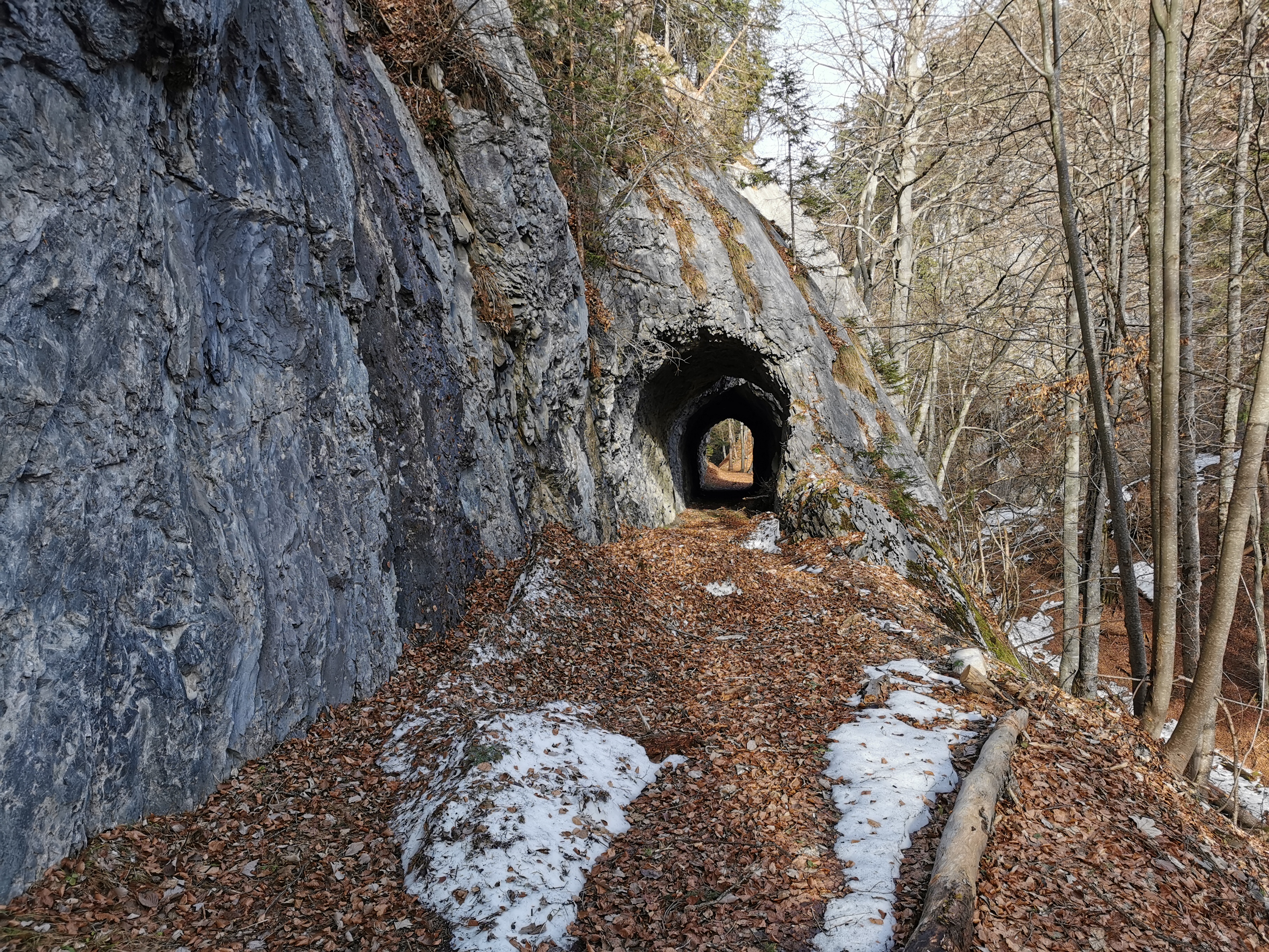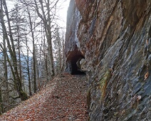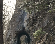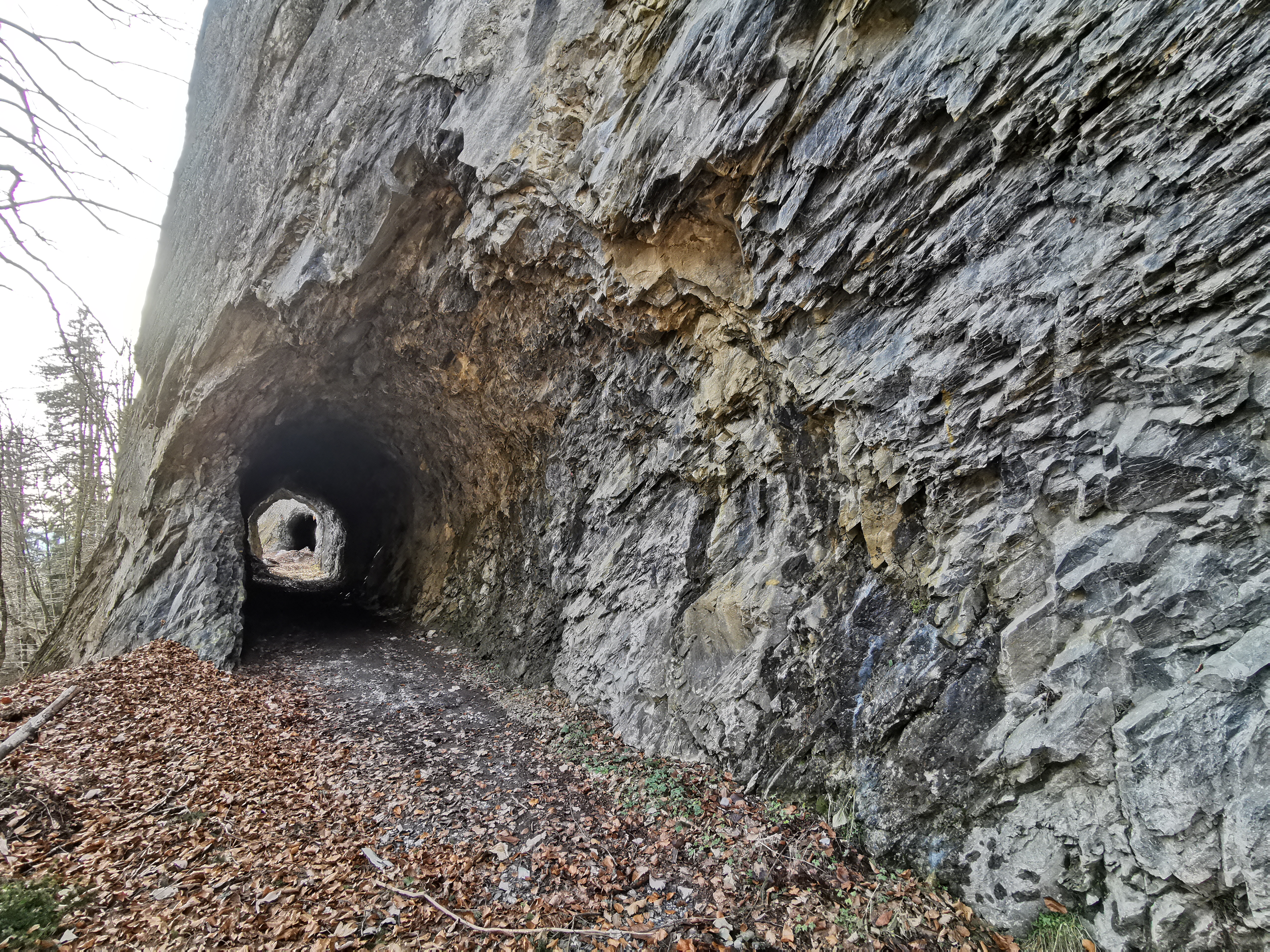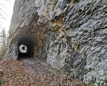 Blick entlang des Forstweges zum südl. Tunneleingang mit der beeindruckenden Felsplatte darüber.