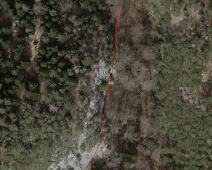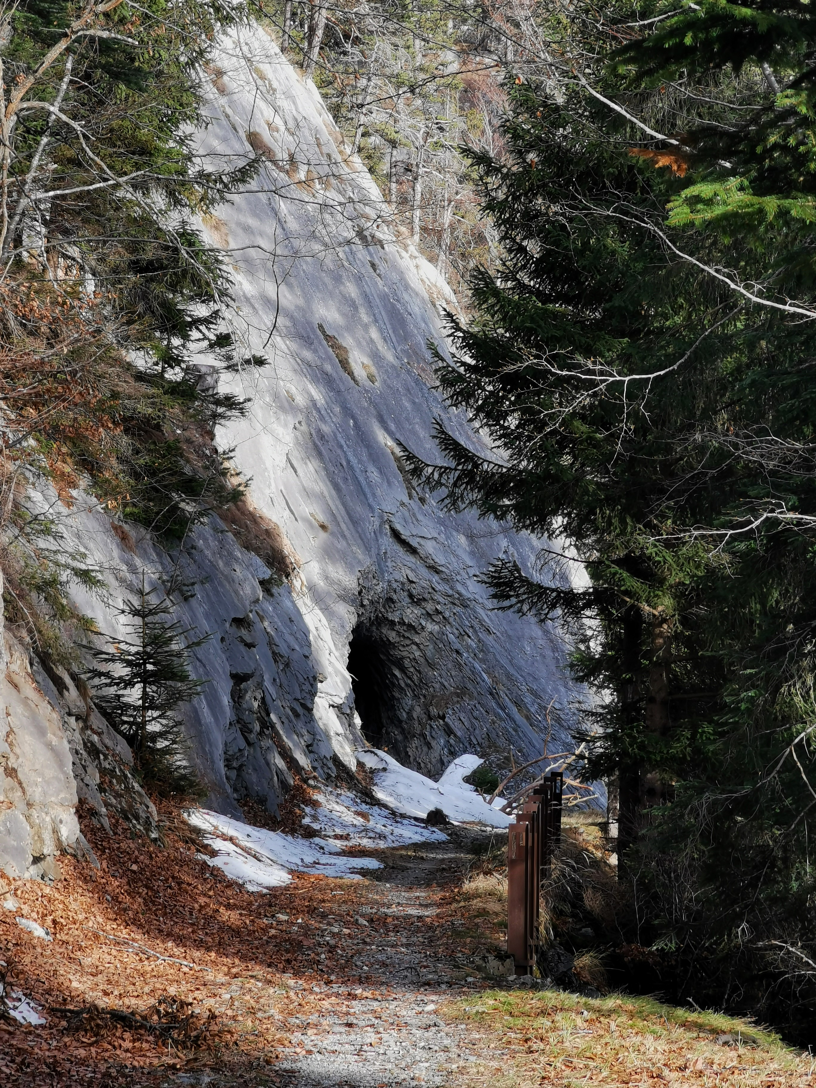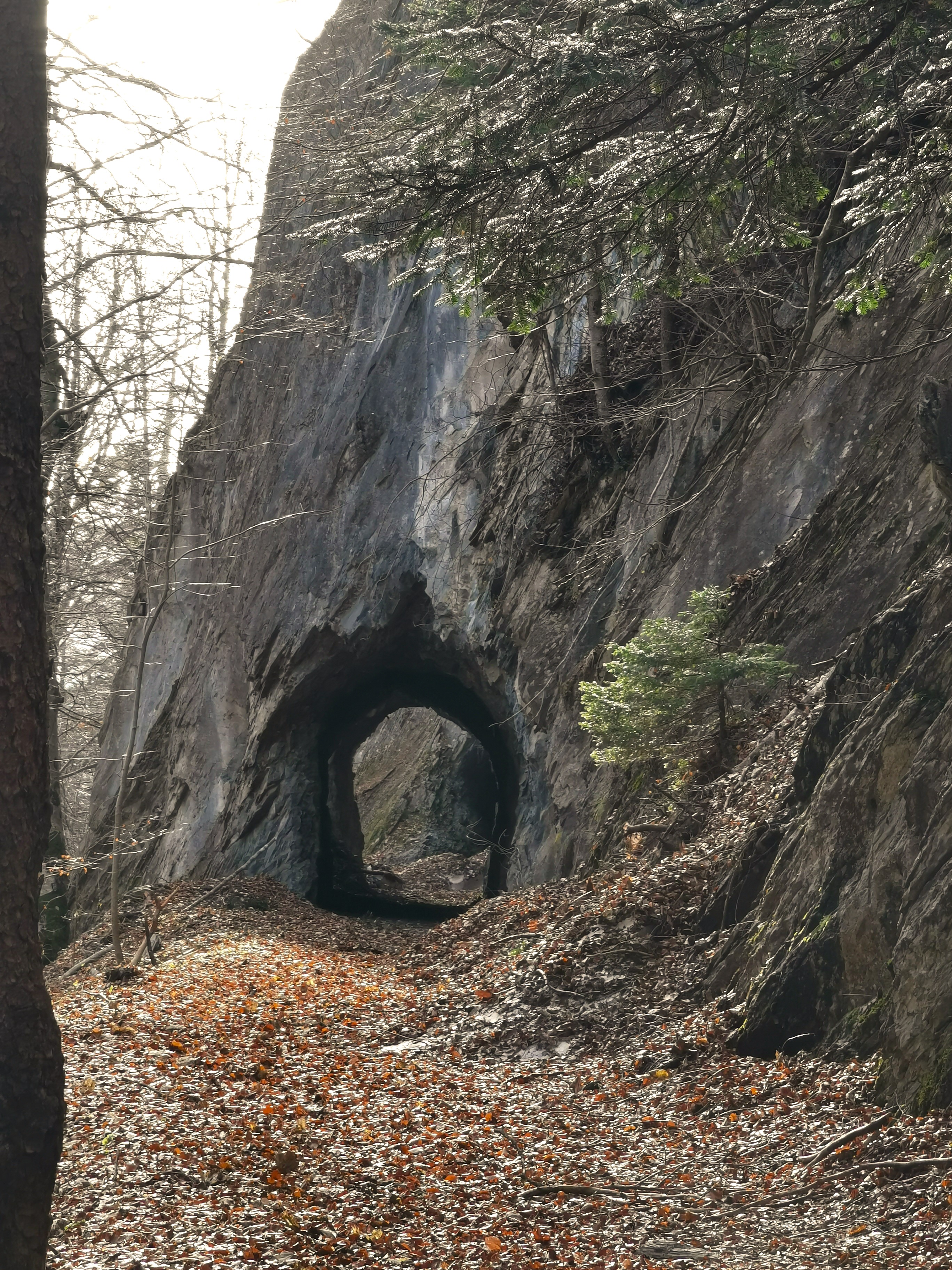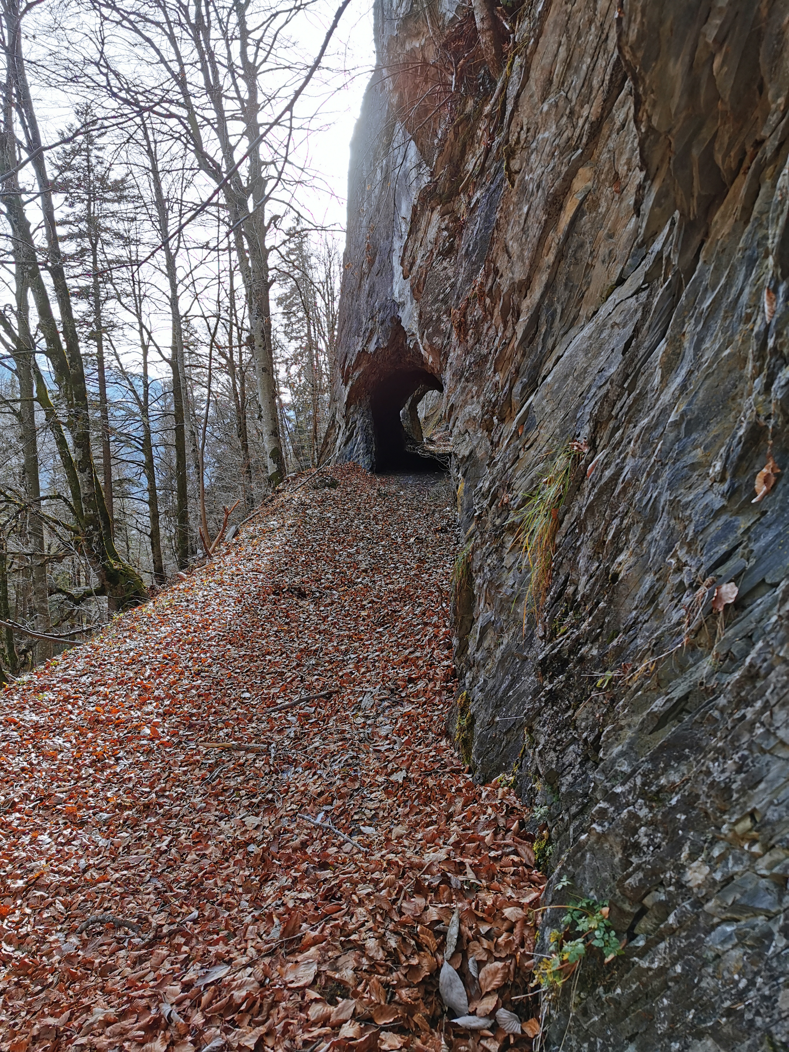 Blick entlang des Forstweges zum südl. Tunneleingang mit der beeindruckenden Felsplatte darüber.