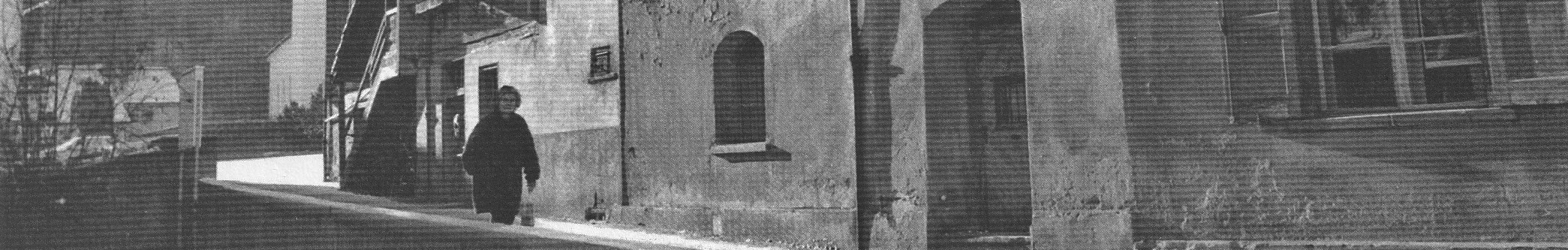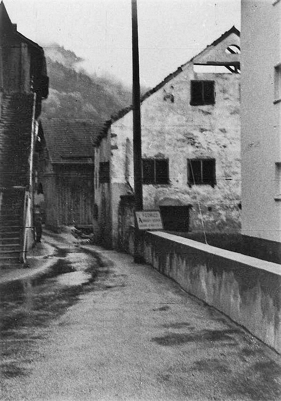 Blick von Süden in die Gasse, rechts das damals bereits abbruchreife Pfarrhaus der ref. Kirchgemeinde, rechts ein Teil des damaligen ref. Schulhauses (Aufnahme…
