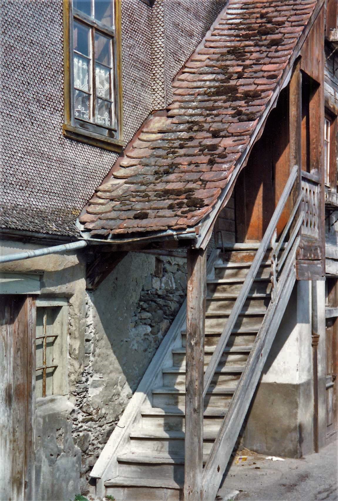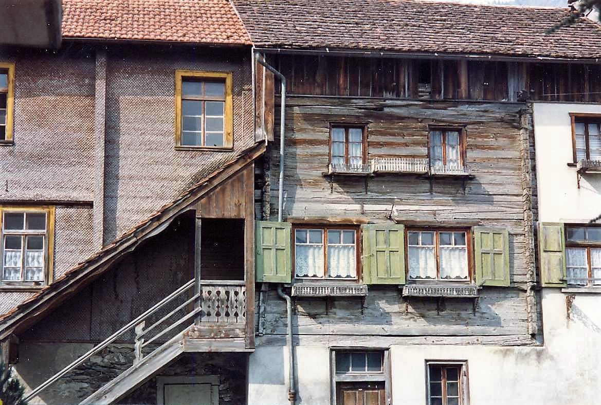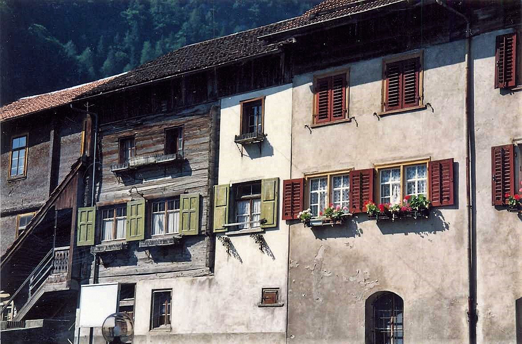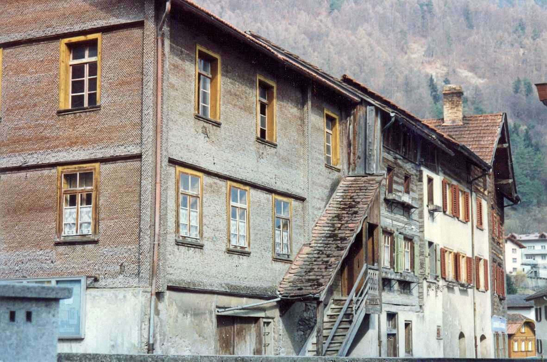 Ehemalige Häuserzeile an der Westseite der Ulmgasse, welche 1997 zugunsten der neuen Gemeindeverwaltung weichen musste. Aufnahmedatum wahrscheinlich 1996.