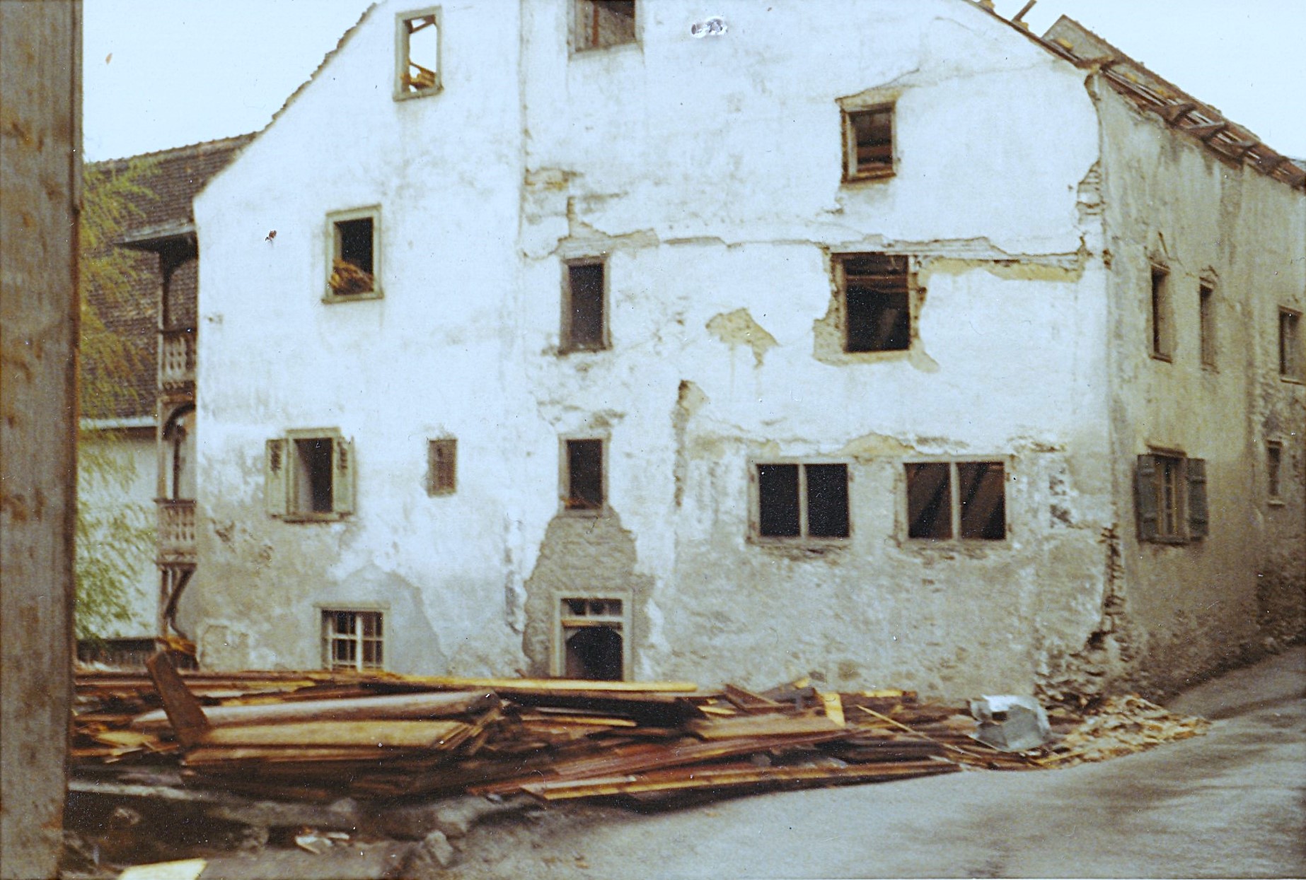 Blick von Nordwesten auf die nördl. Giebelfront des ehem. Pfarrhauses während der Abbrucharbeiten Ende der 60er Jahre des 20. Jh.