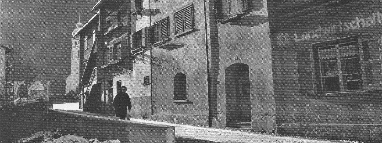 Blick auf einen Teil der Häuserzeile an der Ulmgasse, welche 1997 zugunsten eines Neubaus der Gemeindeverwaltung abgerissen wurde.