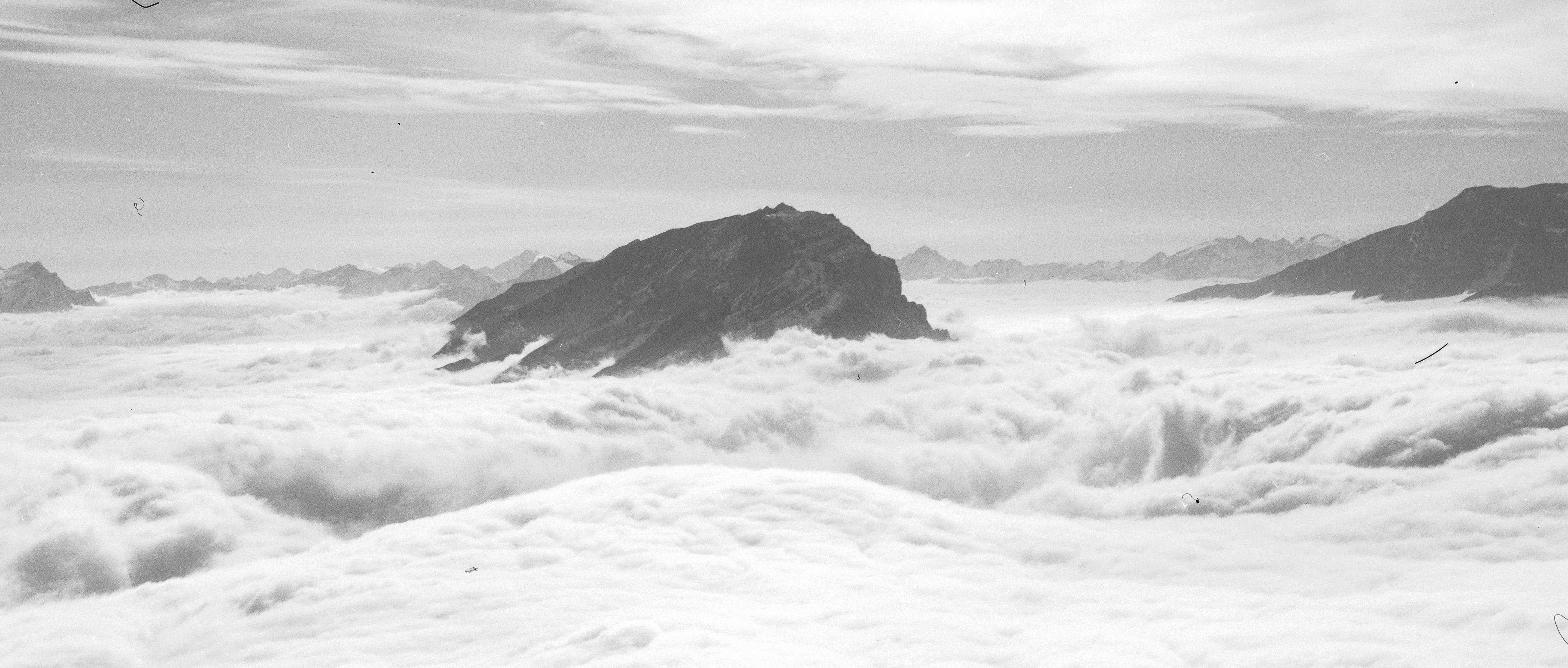 Luftaufnahme auf 1957, Blick aus Nordosten über das, mit Nebel gefüllte Rheintal zum daraus hervorragenden Bergstock des Calandas. Bild: Werner Friedli von…