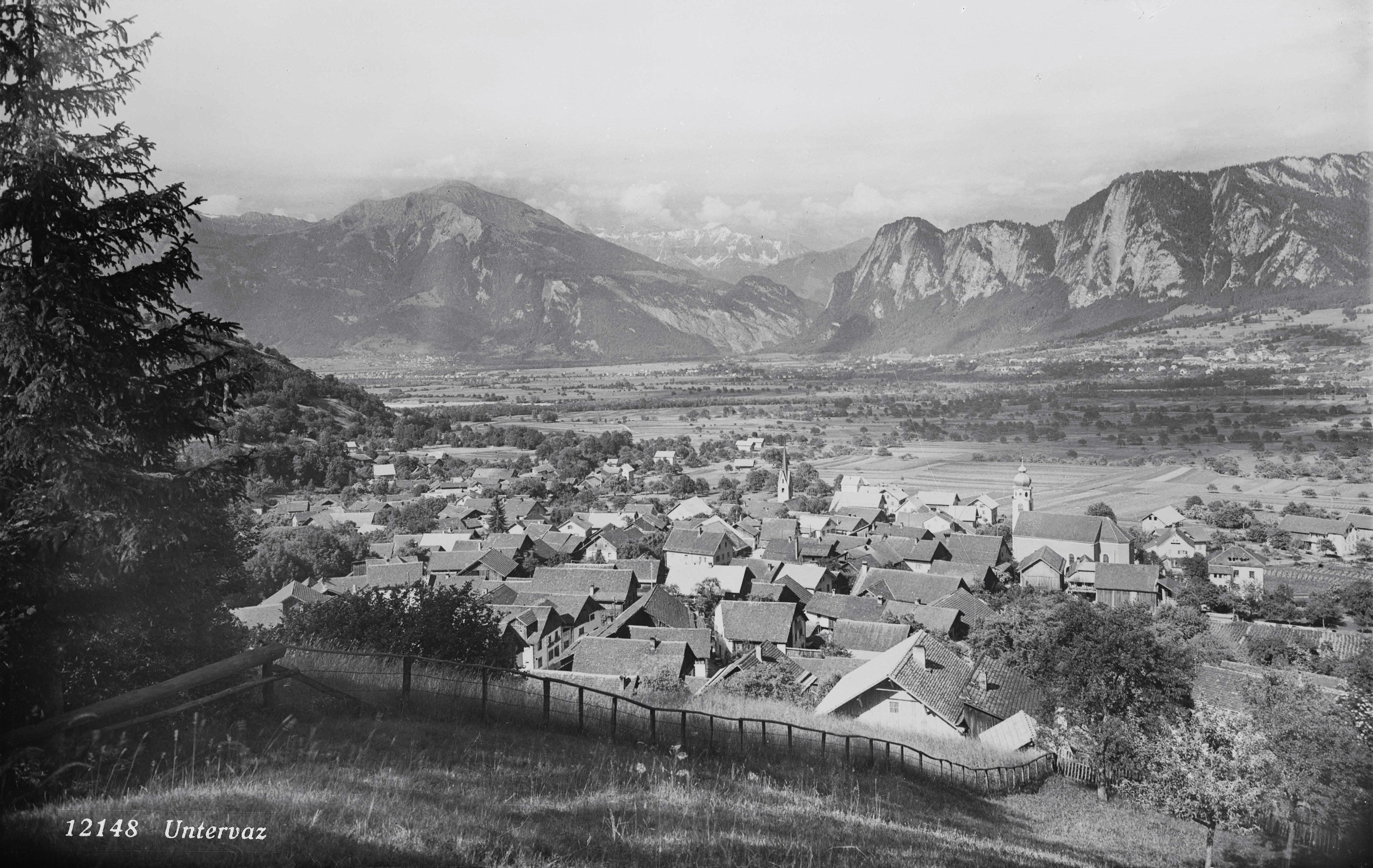 Alte Ansichtskarte von Untervaz von 1925/26. Blick vom Fallboden in Richtung Nordosten auf das Dorf. Dahinter die Rheinebene mit dem damals noch teils…