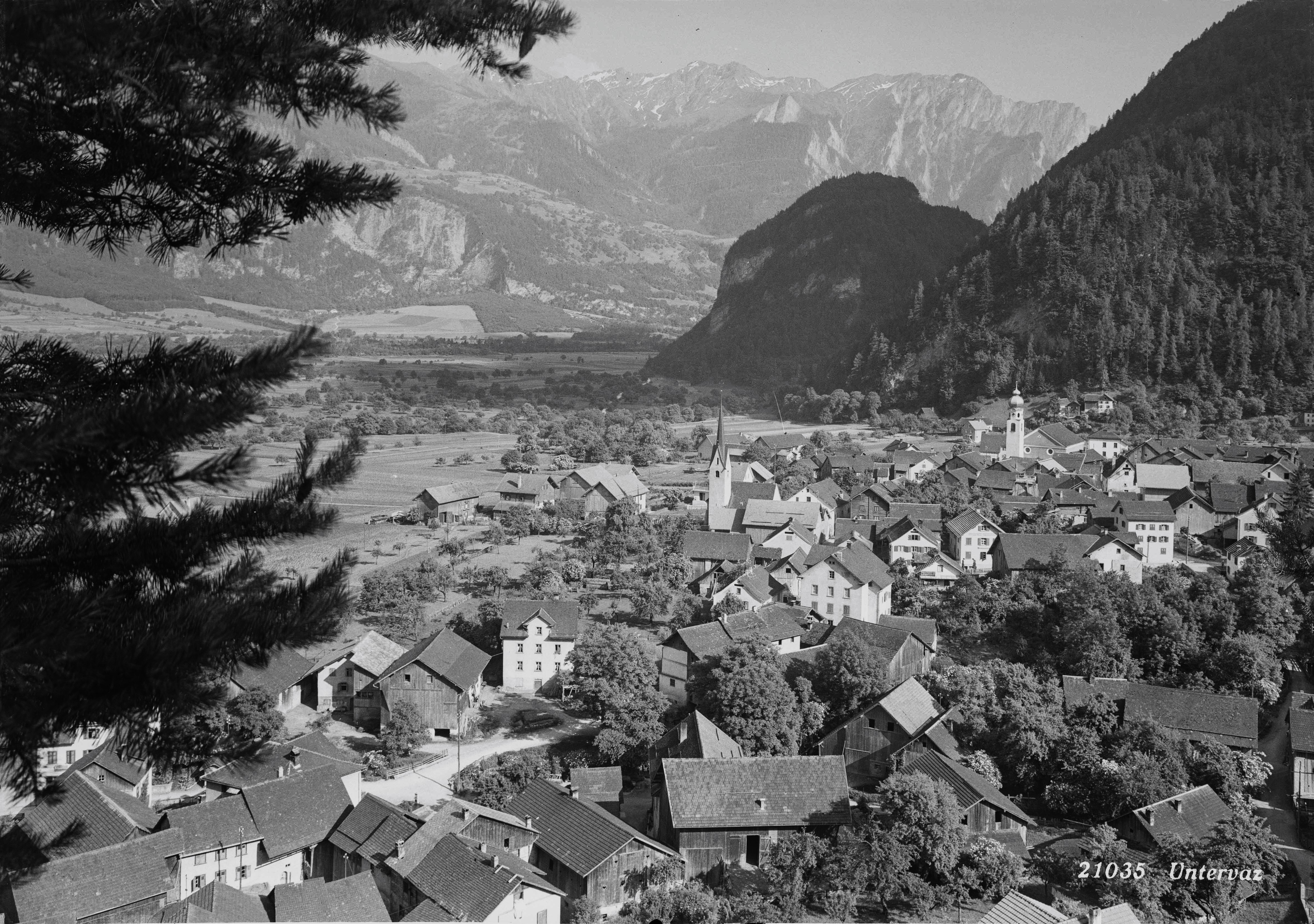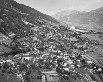 Hochauflösendes Luftbild (wahrscheinlich 1946) von Südosten auf Untervaz. Gut zu erkennen die damalige Feldwirtschaft auf der Rheinebene mit vielen kleinen…