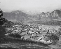 Aufnahme von 1898 - Blick vom Guflis über die Bawangs zur Kirche. Rechts im Bild das Haus 'Calanda', ganz links Teile des Schulhaus Haag. Vor der Kirche das…