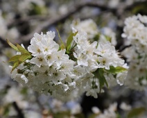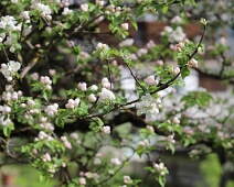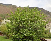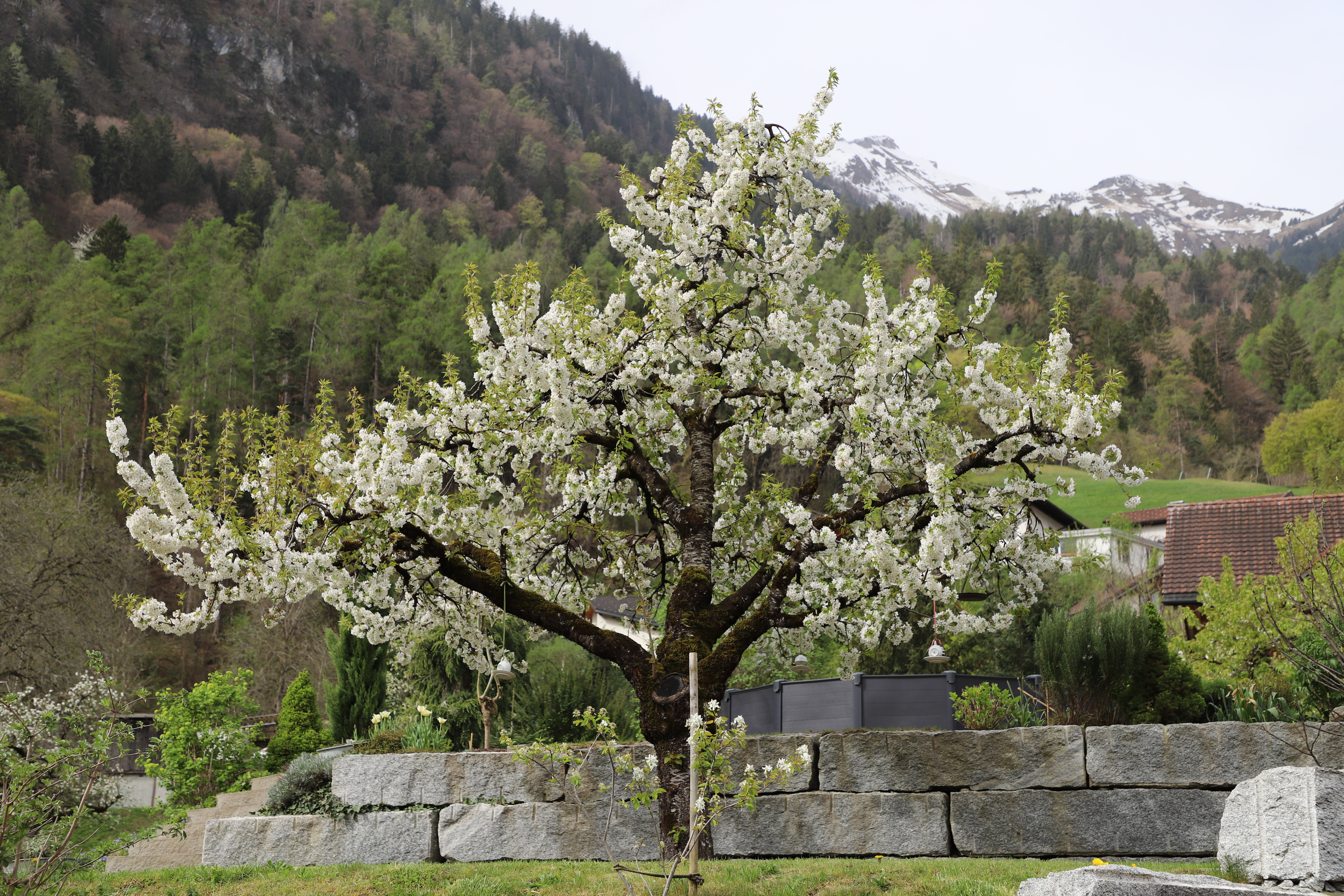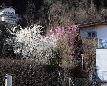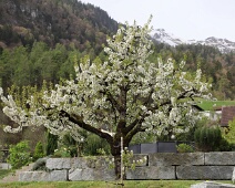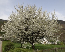 Zu Anf. April herrlich blühender Kirschbaum auf einem Grundstück vom Bsetzi (Haus Nr. 10), Blick vom Rande der Bawangs-Wiese nach Westen, im Hintergrund die…