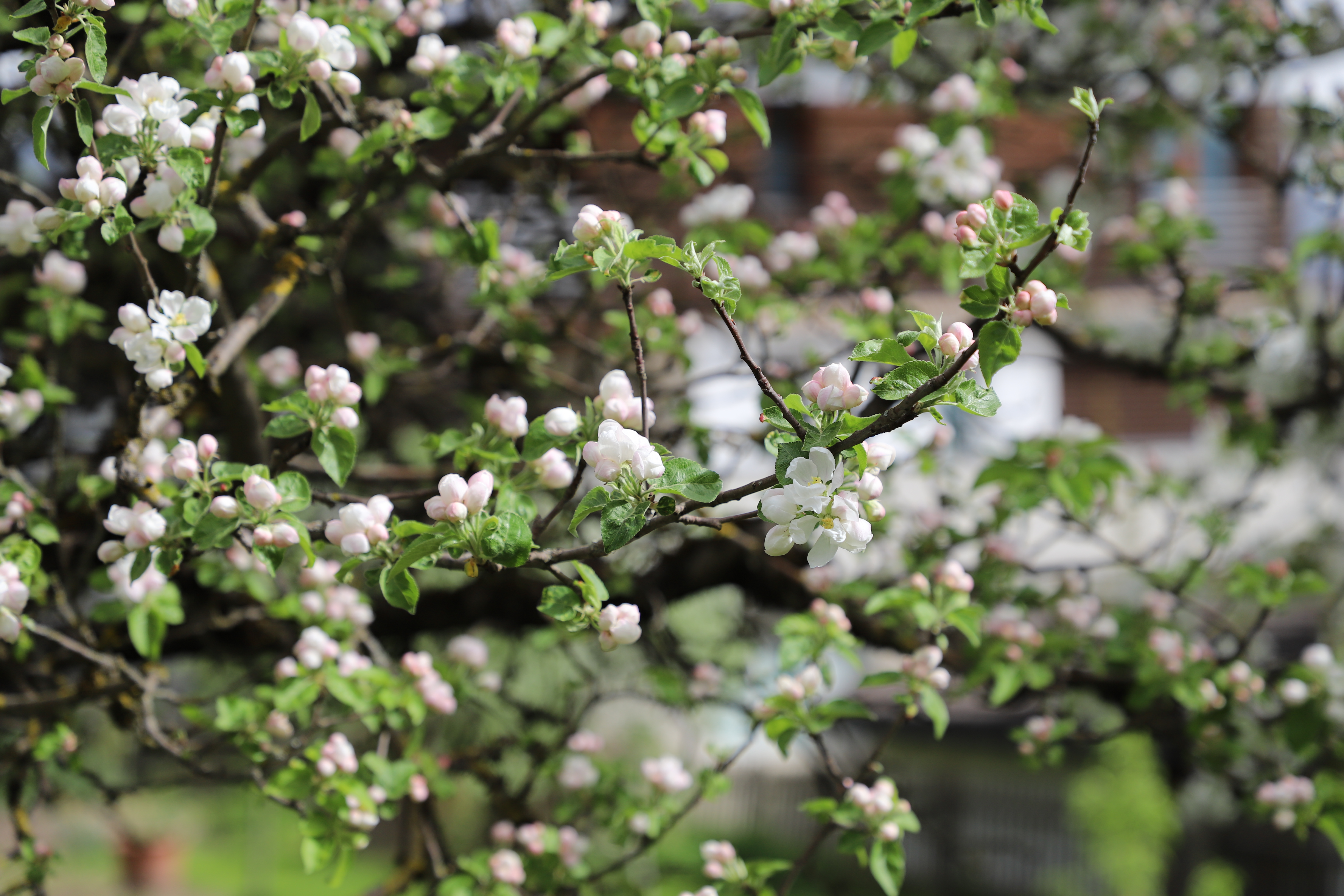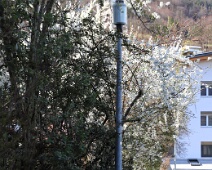 Leuchtende Obstbaumblüte über dem Schulweg nahe der Cosenzbach-Brücke zu Mitte März 2024